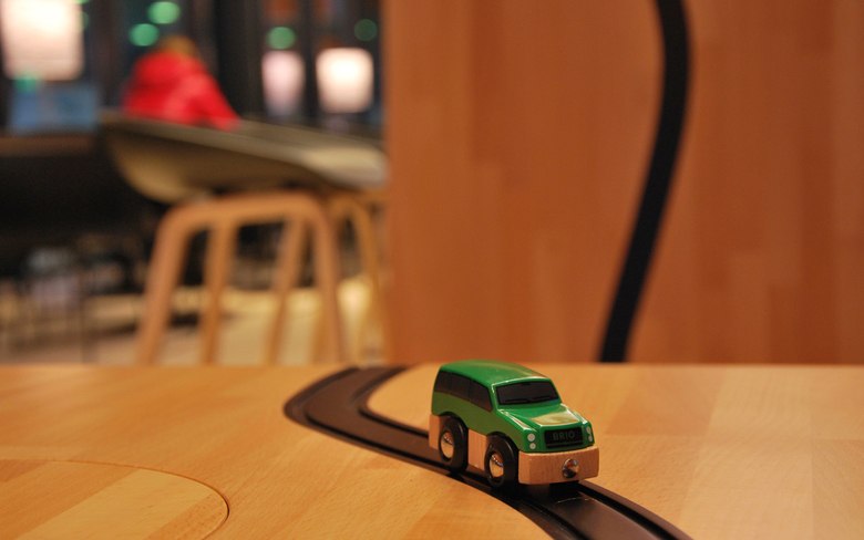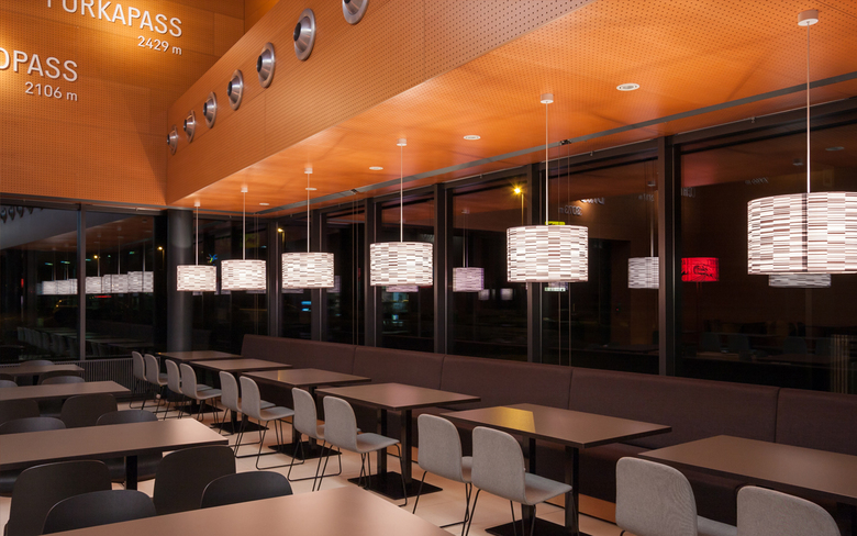 Das Grundelement der neuen Gestaltung der Raststätte MyStop.Gotthard ist ein 48 Meter langes Band aus Holz, das die Nord-Süd-Verbindung durch den Kanton Uri symbolisiert und die Reisenden spielerisch über den Streckenabschnitt und die Gegend informiert. Damit ist für Unterhaltung gesorgt. Das Holzband entwickelt sich zuletzt sogar zum Spieltisch mit Einfräsungen als Bahngleise, was die Kinder besonders erfreut. Die hohen Wände werden als abstrahierte Panoramatafel genutzt und damit die Besucher auf die umliegende Bergwelt aufmerksam gemacht. Die moderne Möblierung und ein spannendes Lichtkonzept tragen zur attraktiven Gesamtstimmung bei.