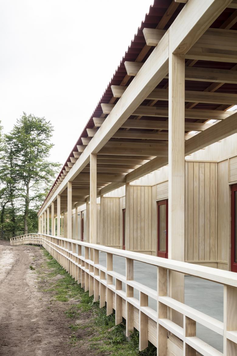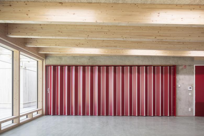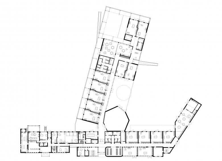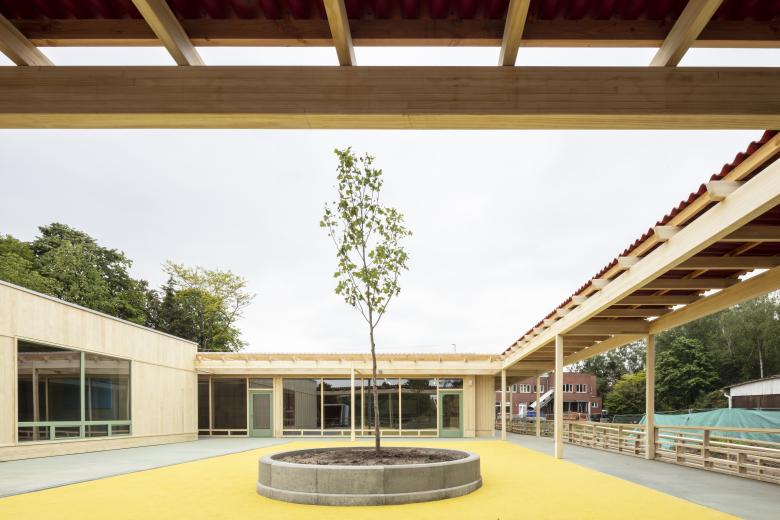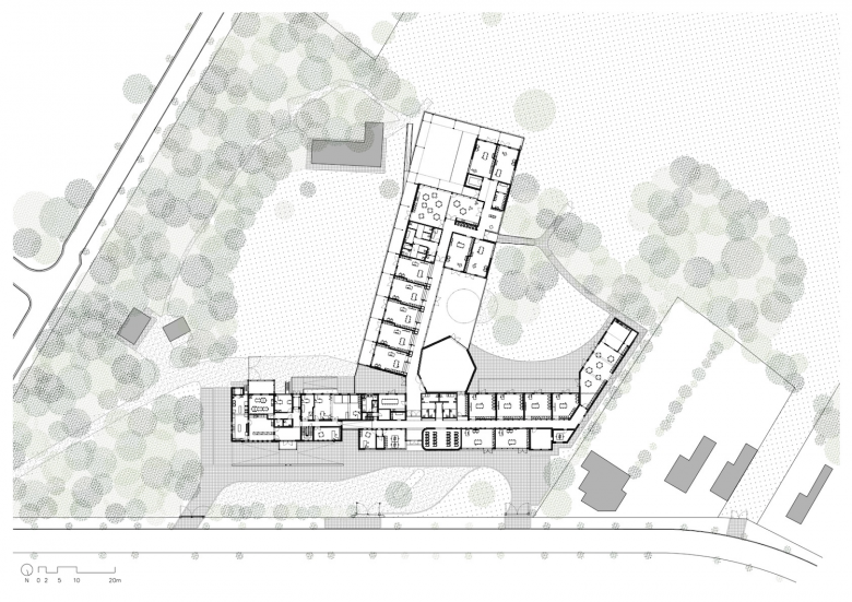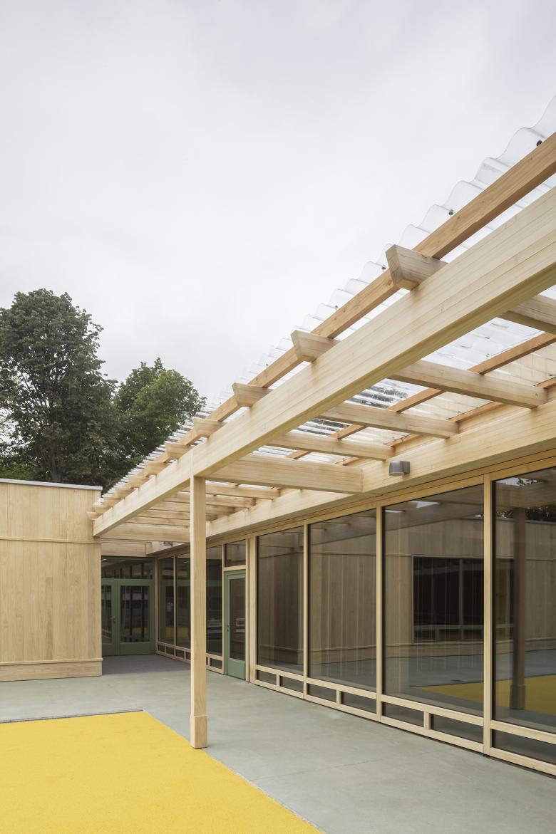 The new classrooms are linked “en fillade”, creating a sequence from the existing secondary school wing, through the primary school levels all the way to the toddlers. As the children aren’t sorted according to age, but according to mental capacity, so are the classrooms carefully positioned according to their exposure to the outside world, supporting an increasing complexity as each child, at their own pace, grows to become more self-sufficient.