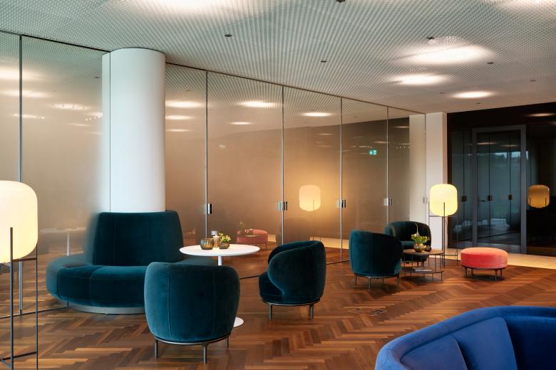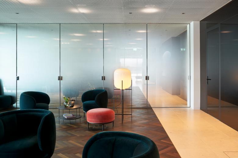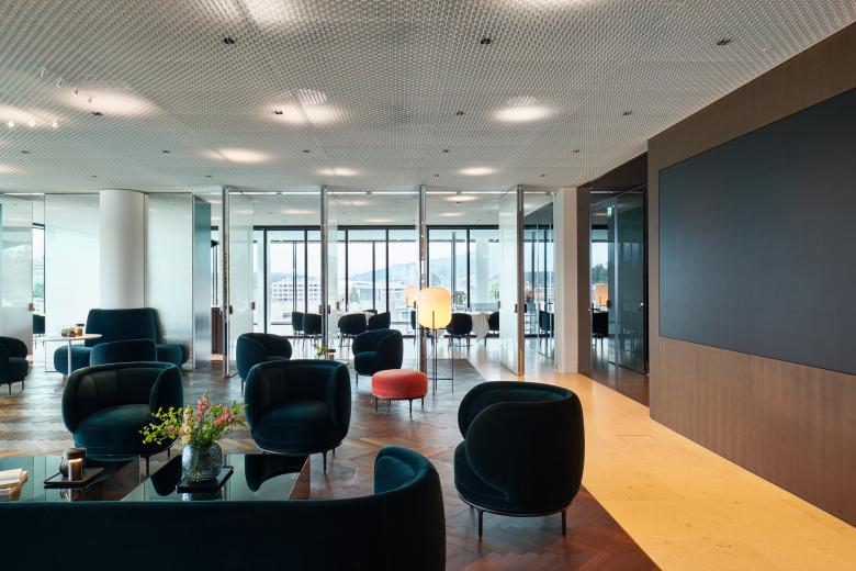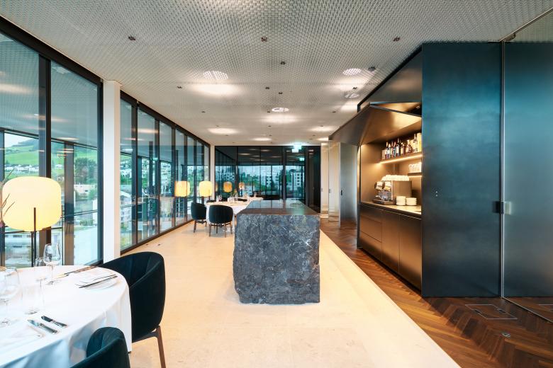 Materialien wie warmgewalzter Stahl, Naturstein, Glas und Holz geben dem Raum eine ganz eigenständige Atmosphäre und erfüllen die hohen Ansprüche an Qualität, Langlebigkeit und Schweizer Tradition. Die «Sky Lounge» besticht nicht nur durch