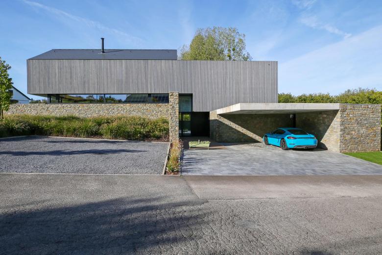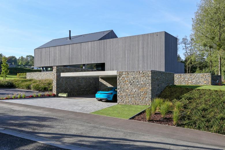 L’espace de cour ouverte côté rue est renforcé par la dalle du car-port en porte-à-faux sur deux côtés.