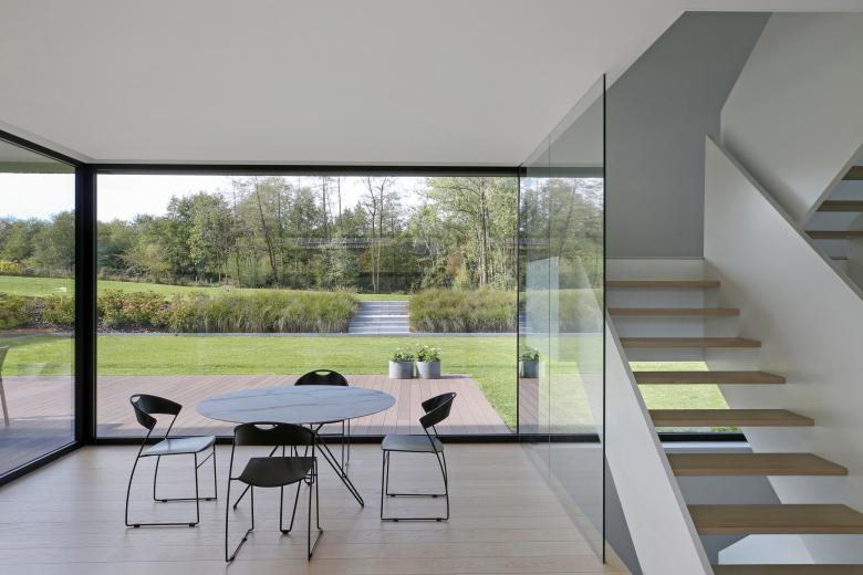 La différence de niveau entre rue et jardin a orienté le choix d’une distribution par demi-niveau offrant ainsi des perspectives internes entre espaces au travers de la cage d’escalier centrale.