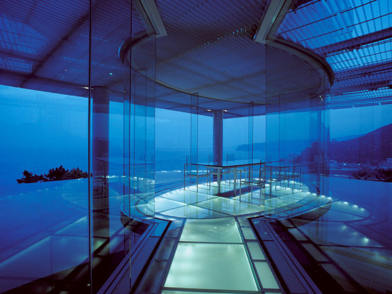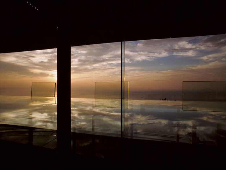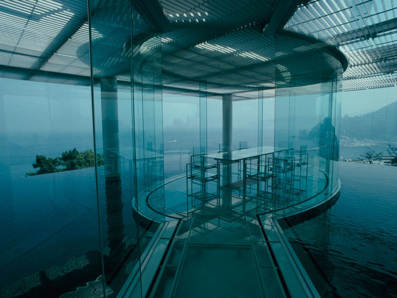 Taut specifically paid attention to mechanisms in Katsura Palace that provoked the framing of nature with nature: the eaves and the bamboo verandas. Thus, in our villa, a layer of water which gently covers the building edges signified bamboo verandas in Katsura. Moreover, a stainless louver that roofs the water signified the eaves. The water surface stretches further out and unites the surface with the Pacific Ocean. And on top of the joined surface, a glass box floats. As the box is super-imposed numerous times, refraction of materials brings in reflections of sorts. The relationship between the subject and the environment is challenged upon in various manners by re-defining and re-shaping the Katsura philosophy, yet always maintaining its fundamental essence.