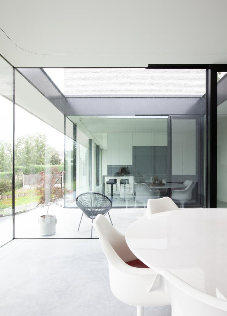 Boven het kelderniveau veruitwendigt een glazen schijf de ligging van de leefruimtes. De transparantie accentueert de voorgevel en biedt tegelijkertijd een panoramisch uitzicht over het groene Tervuurse landschap. Een doordachte overkraging in de volledige zuidgevel voorkomt oververhitting in de zomer, maar verzekert passieve zonnewarmte in de winter.