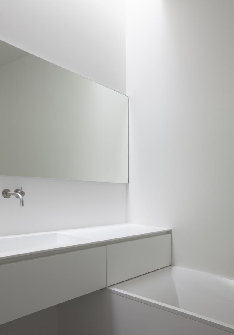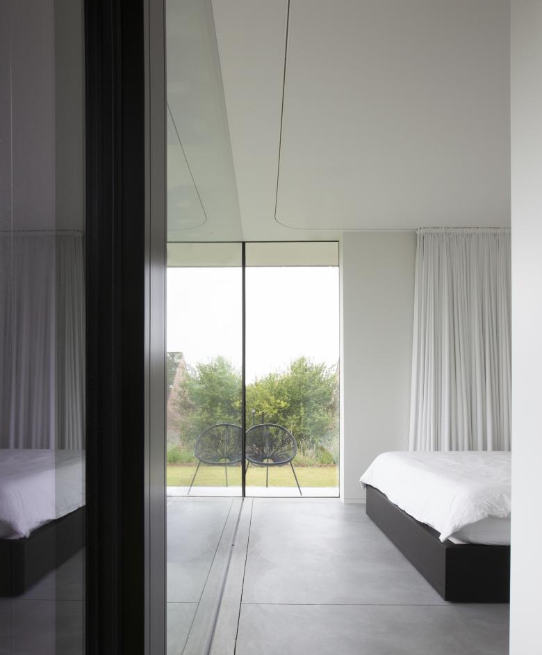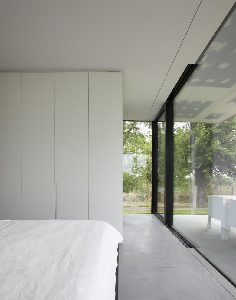 Het gesloten vlak in de voorgevel beschermt de ouderlijke slaapkamer en een badkamer tegen ongewenste inkijk. Deze nachtzone vormt een intieme wereld op zich met een overdekt buitenterras dat grenst aan een zwembad in de zijtuin. De badkamer geniet van daglicht dankzij een lichtstraat. Een schuifraam in de slaapkamer kadreert het zicht op de omgeving.