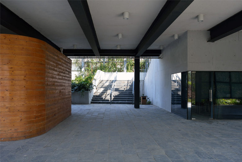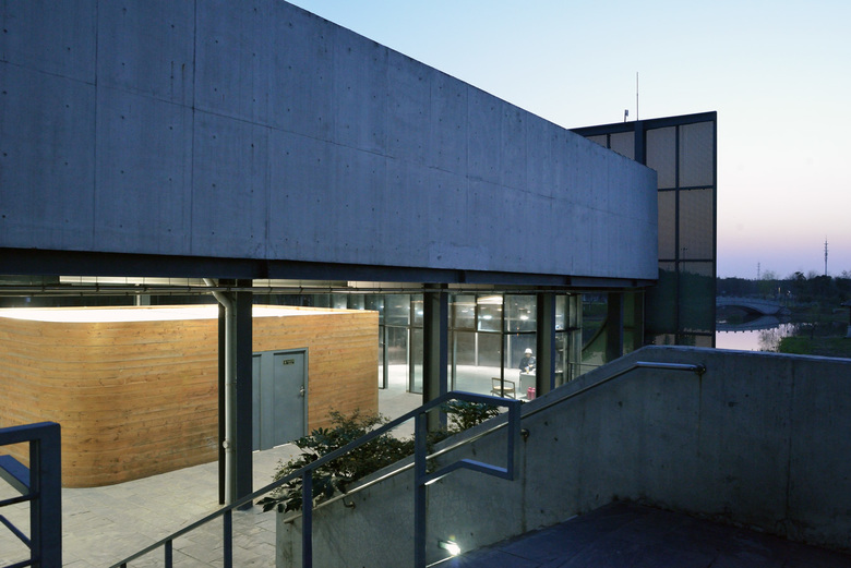 How should the Center present such a simple landscape to the visitors? The site offered an opportunity. The sunken Xincheng Road separates the site from the railway station plaza to its east. An existing footbridge connects these two, with the bridge floor 4.45 meters above the site. Because the railway station plaza has barrier-free connections to the surrounding sidewalks, bike paths, and several bus routes, we placed the entrance to the Center at the footbridge rather than on the ground of the site. Visitors enter the building via the second floor, affording them an overlook of the Park. Three “suspenseful” techniques further enhance the experience. First, the 73-meter-long footbridge is prolonged by an 18.7-meter-long extension, with façade module, floor material and railing matching that of the bridge. Once stepping on the bridge, people’s curiosity is aroused by a glimpse of the distant Center. But only after they pass through the 92-meter-long “corridor”, will they arrive at a second-floor plaza. Perforated aluminum panels and concrete wall of 3-5 meters high surround the plaza, with trellises floating 6-7 meters above the floor, making the plaza a semi-outdoor “hall”. Within it, people cannot see much of the surrounding landscape except through a huge semicircular gate, nine meters in diameter, in the middle of the western wall. Only within this unique framing the Park finally reveals itself. With these two preludes, it is hoped that the ordinary local landscape will appear extraordinary in visitors’ eyes. A shallow pool lies in front of the gate, seeming to lay an illusory path into the Park. But in reality people have to turn right and descend through a grand outdoor stair to the first floor where real paths into the Park begin. The temporary delay produces yet another suspense to strengthen one’s desire to explore.