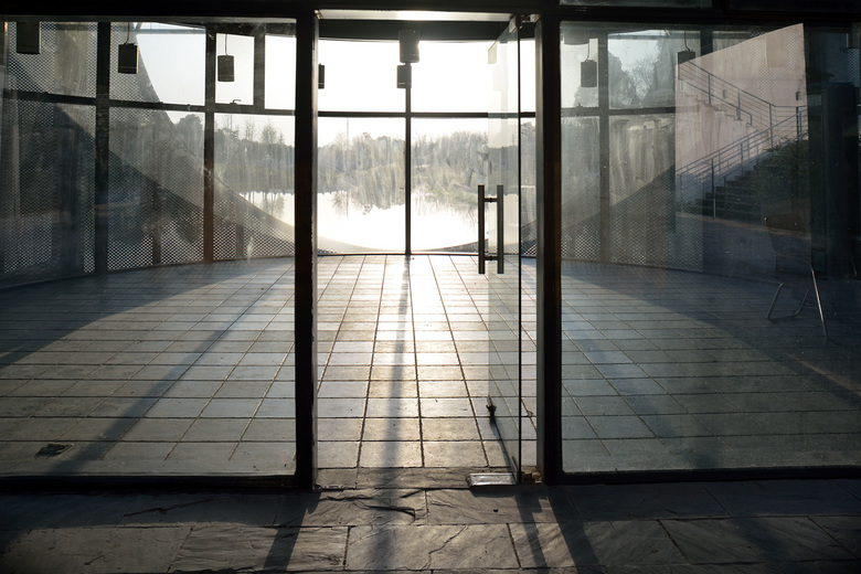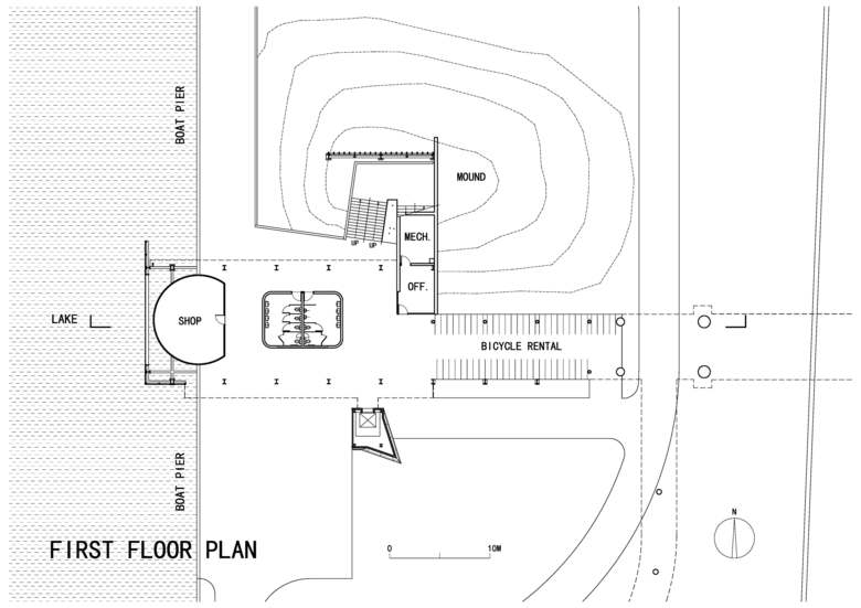 Most part of the building is lifted on stilts to allow maintenance vehicles to pass the first floor. All utilitarian functions are accommodated here. A glass cylinder stands at the west end of the first floor, to be used for tourist orientation and a gift shop. Here people will find that the semicircular gate seen on the second floor is really the upper half of a circular opening, which echoes with the round plan of the shop. The east end of the first floor will be used for bicycle rental, with its own entry and exit. Public bathrooms with wood siding are nested in the middle of the first floor. They appear as an object detached from the building above, stressing the floating feel of the second floor. The west end of the building cantilevers over the river outside, flanked by boat piers on its south and north sides. The open ground to the south of the building will be used as a boarding area for the future horse carriage service. Lastly, both of the south and north sides of the Center are connected to the pedestrian/biking path system of the Park, making the Center a hub of the multiple tourist routes in the Park.