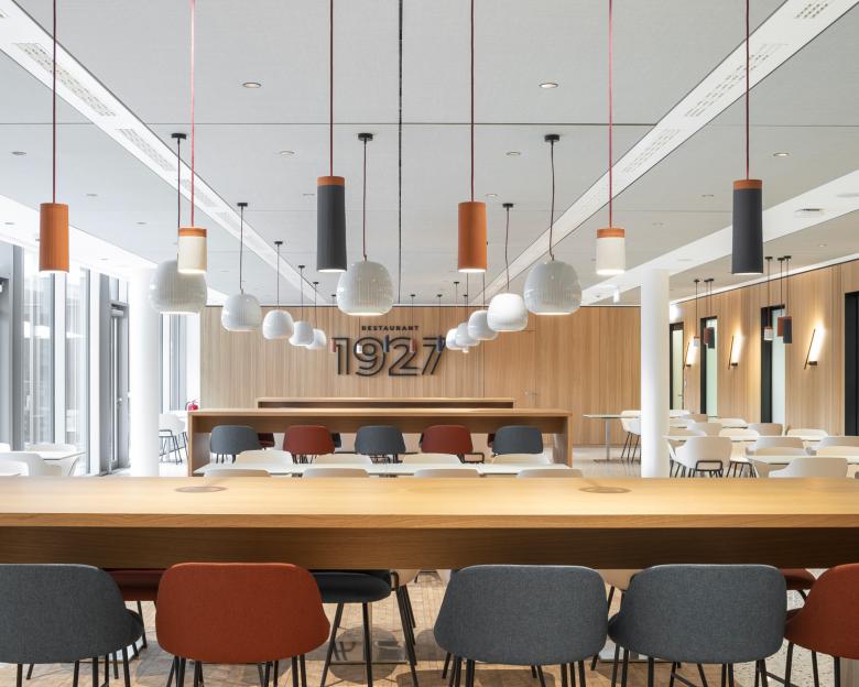 La distribution principale et transversale au rez-de-chaussée est retravaillée et renforcée dans sa programmation. Elle accueille une série d’espaces communs, des salles de conférence, des lieux de rencontre et des espaces de restauration comme des cafétérias. Un restaurant principal est implanté au rez inférieur, offrant une extension sur un des patios. Un auditorium de 100 places complète l’offre de salles de conférence.
