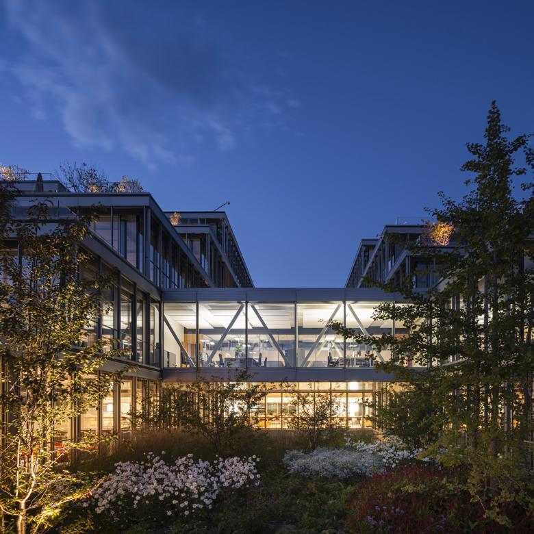 L’enveloppe est constituée de façades rideaux bordées par des coursives protégées par des stores de protection solaire. Ce système, simple et éprouvé, permet d’ouvrir généreusement la vue des espaces de travail sur les espaces végétalisés entre les bâtiments, ainsi que sur le paysage plus lointain.