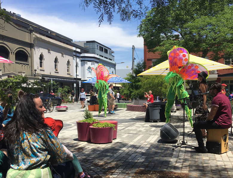 Widened footpaths across Greville Street aim to re-encourage equitable social exchange through outdoor café dining, casual seating mixed with planting, and footpath trading zones. A new focus on diverse planting reprioritises the pedestrian and allows for the proverbial pause, with moments to reflect, unwind, or simply Instagram under the catenary lights.