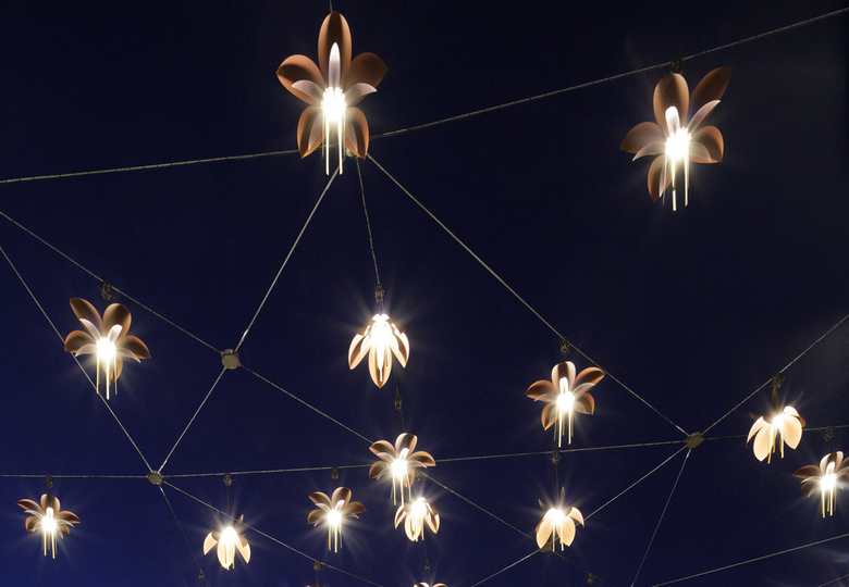 Our design ethos recognises that partnerships with local artists greatly enrich the outcome. Jan Flook, a specialist lighting artist, was engaged to design and construct fifty custom anodised aluminium light fittings for the catenary. We highly valued his expertise and craft that seamlessly melded into the botanical brief, settling on the Wahlenbergia flower as a motif. Jan brought to the project keen intuition and technical innovation; the end result has become a distinct feature of the precinct.