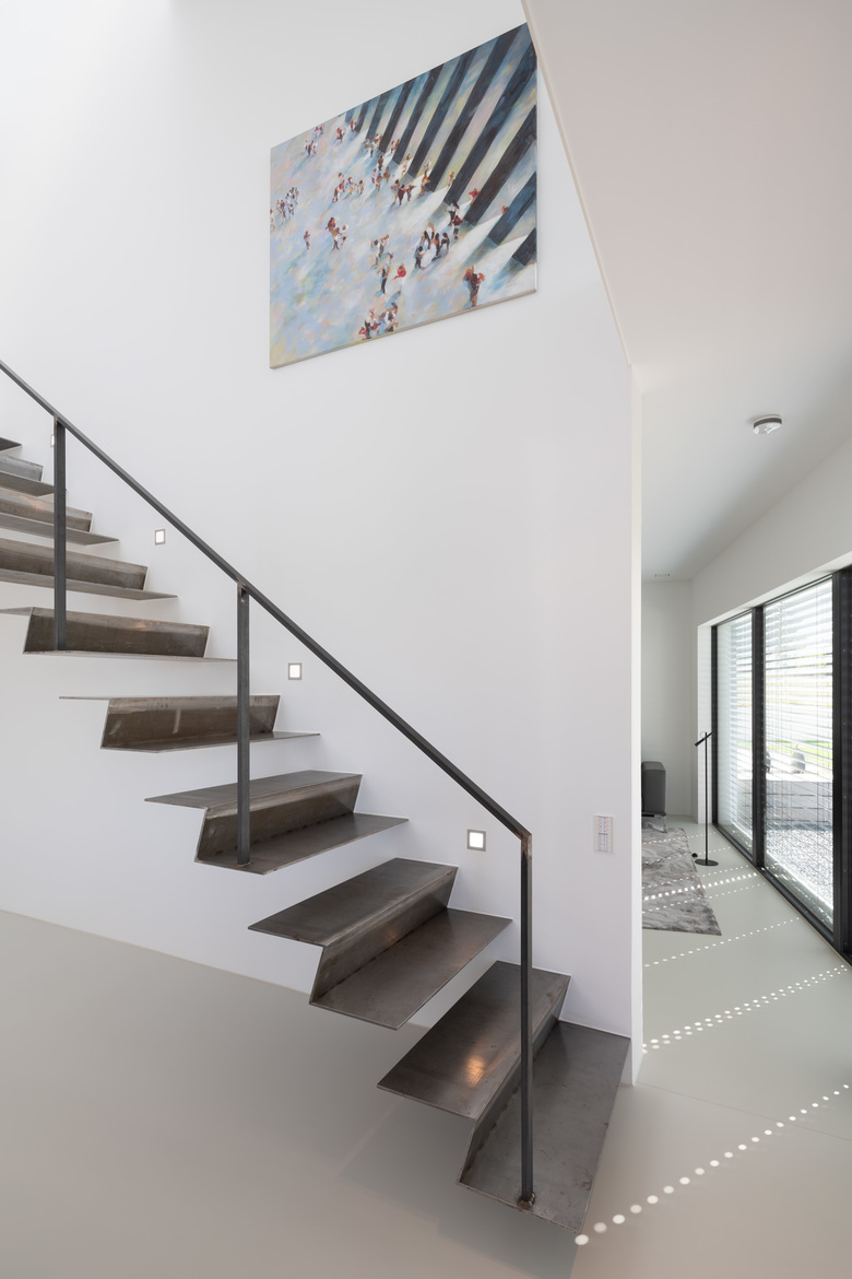Das Gebäude erstreckt sich längs der nördlichen Grundstücksgrenze und erweitert durch eine eckig konvexe Form seine Oberfläche Richtung Aussicht welche sich bereits im Erdgeschoss bietet. Da das Erdgeschoss mehr als 2,50m über der Straße liegt ist die Privatheit der Bewohner gewährleistet. Im Obergeschoss wurde der Westliche Gebäudeteil herausgedreht und fokussiert sich auf die Aussicht.