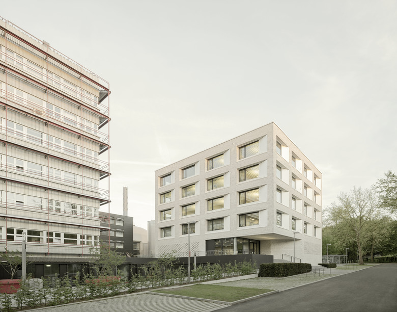 Nutzung des Neubaus als Bürogebäude mit flexibel nutzbarem Foyer/Kundenzentrum (EG), stützenfreien Flächen für Einzel- oder Großraumbüros, Kundenzentrum, Lager und Technik sowie Besprechungs- und Schulungsräumen. Verkleidung der Fassade mit Ziegelmauerwerk. Bestandsanbindung des Neubaus über eingeschossigen Verbindungsgang (Stahl-Glas).