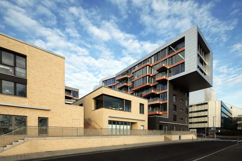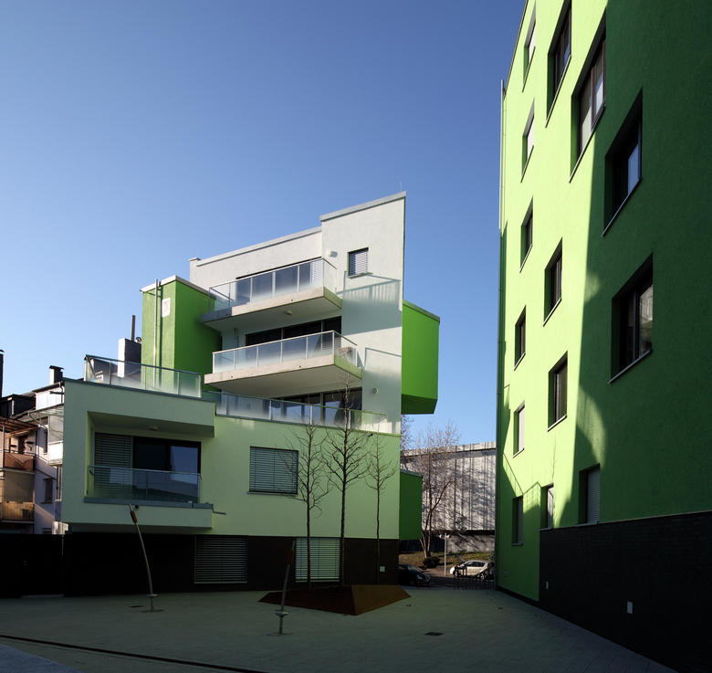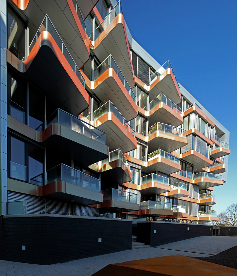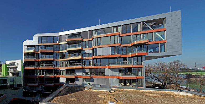 Neubau einer Wohnanlage direkt am Rheinufer in Bonn. Der Gebäudekomplex besteht aus vier charakteristischen Einzelgebäuden, die sich auf einem hochwassersicheren Plateau um einen grünen Hof gruppieren. Der Gestaltordnung dieser Häuser liegt ein orthogonales Netz zugrunde, dessen Ausrichtung im Stadtgrundriss dem barocken Hofgarten folgt. Die diagonale Ausrichtung aller Blickbeziehungen über den Rheinbogen und die Bonner Stadtsilhouette hin zur Horizontlinie des Siebengebirges formt die einzelnen Häuser. Das Ensemble umfasst 75 Wohnungen von 80 bis 220 m² Wohnfläche, mehrere Ladenlokale im Gebäudesockel und 90 Garagenstellplätze auf einer zweigeschossigen Tiefgarage.