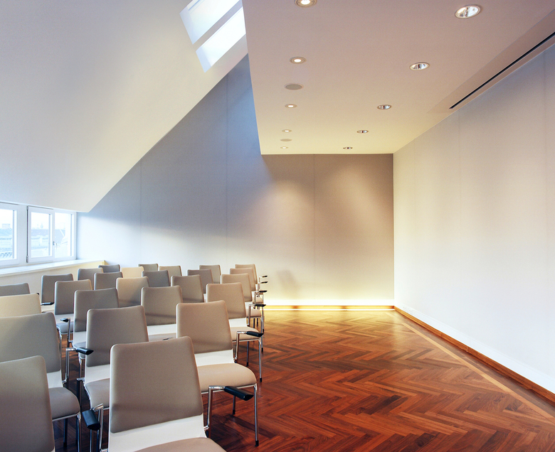 Dachausbau eines Gründerzeithauses an der 2er-Linie mit einem Vortragssaal, Besprechungs- und Beratungsräumen sowie Büroarbeitsplätzen auf der Galerieebene. Durch einen Materialmix aus Marmor, Nussholz, Stahl, Glas und Stoffbespannungen soll sich Massivität mit Leichtigkeit und Transparenz verbinden, zeitgenössisch und tradiert.
