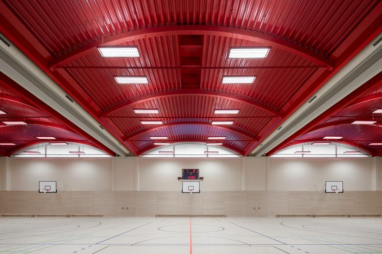 Coppi-Gymnasiums und schafft durch die eigenständige Architektur neue Qualitäten. Das maßgebliche Gestaltungselement wird durch ein dreiteiliges sichtbares tonnenförmiges Dachtragwerk definiert, das die typologische Sonderform in Innenund