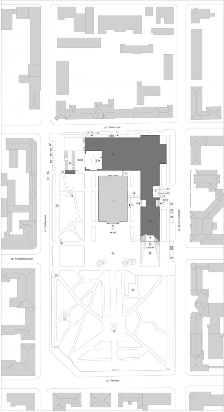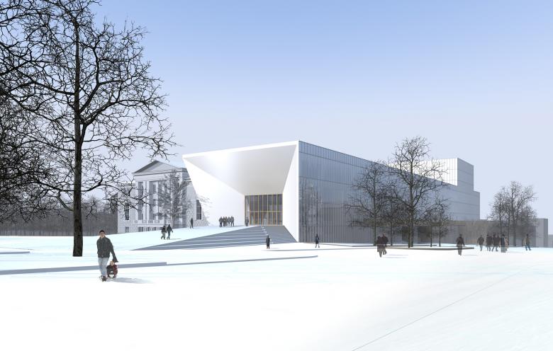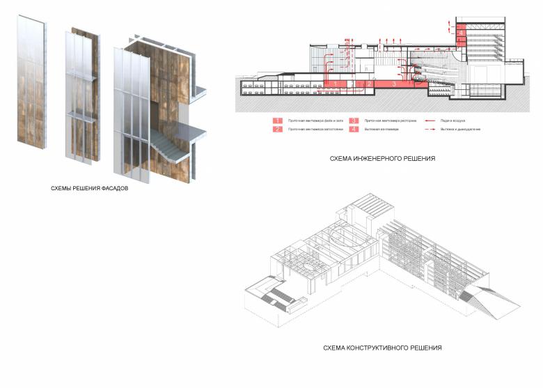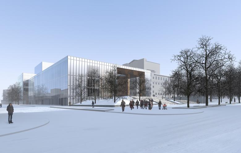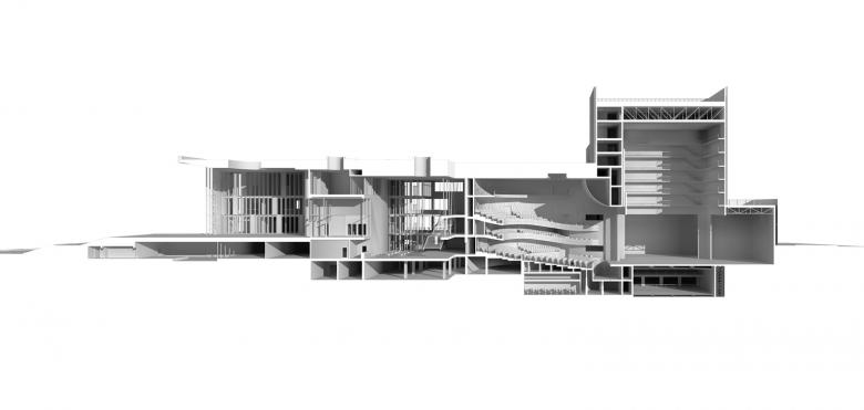 The main effort in the work out process to prepare the competition offer was concentrated on the attempt to create a theatre machine. The second half of our concept rested upon necessity to meet the client`s demand to find an optimal solution in using both Old and New stages of the theatre. The search for functional practicability was the key principle reflected in our final version of the project. The next thing of primary importance which we felt obliged to observe in our work carefully was continuity and very smooth development.