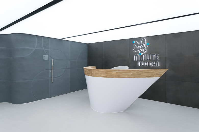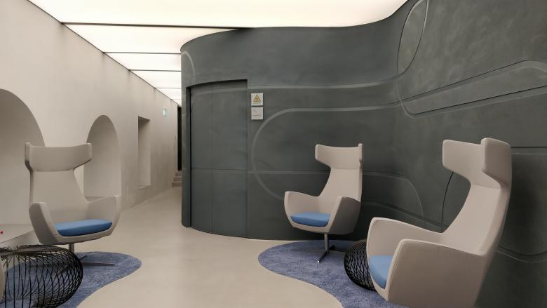 Cleane Farben, matte Oberflächen und außergewöhnliche Formen spiegeln ein einzigartiges und futuristisches Design wieder. In dieser besonderen Architektur wurde jede Ecke optimal eingesetzt und die besonderen Formen sowie die LED-Lichtdecke im Wartezimmer verleihen ein Gefühl von Unendlichkeit.