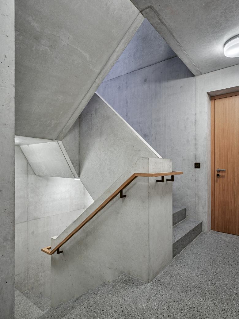 This dynamic internal spatial concept of room layers and bay windows, balconies and attic terraces is subtly distinguished by fine nuances in the exterior plaster. Rough, coarse and self-shading areas of trowel-thrown plaster contrast with fine and smooth bands. The façade’s precise articulation reinforces the reading of the building’s stories. Rigid openings corresponding to interior spaces are woven into a unified whole, bestowing the building with the desired urban character.