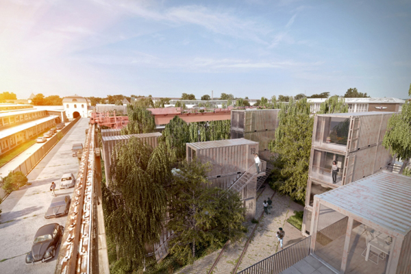 The location of the site on the outskirts of the city of Dresden is a former military barracks with a rich history. Existing cranes, railway tracks, concrete floors and cobble stones can be traced back to its original function as a freight depot. These historically significant features establish a link to modern day transport and mobility around the site, as well as providing the context for an unusual project to attract a young demographic. The Boarding House in Dresden consists of 150 shipping containers stacked vertically together. This creates compact building volumes that comprise of up to four different hotel rooms. The towers allow for sufficient transparency and at the same time ensure a high urban density. A large part of the original pavement is cut away allowing a birch forest to grow over time. The containers’ volumes are sporadically placed in the forest creating numerous semi-public outdoor spaces. A forest path formed from remnants of the original floor laces all elements together and refers to the omnipresence of history that reveals itself in a palimpsestic way.