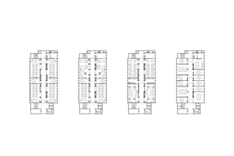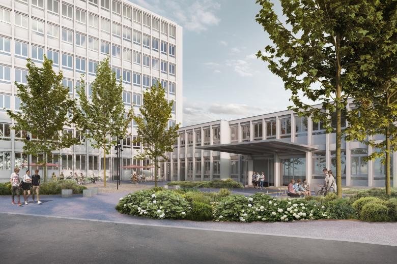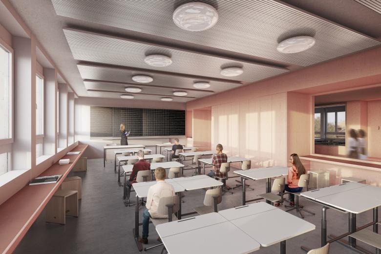 Students of the secondary school will reach their classrooms via a new staircase leading up from a decluttered entry foyer. The former radio tower’s layout is perfectly suited for educational use: it can be organised into clusters of three classrooms, two breakout rooms, and a common area each – ideal for contemporary educational and childcare concepts. On the ground floor, a dining hall with a new kitchen and terrace will be built to meet the requirements of an all-day school. Even before the new construction which constitutes the second phase is completed, one room for gymnastics and another for active play will provide the necessary space for physical education instruction.
