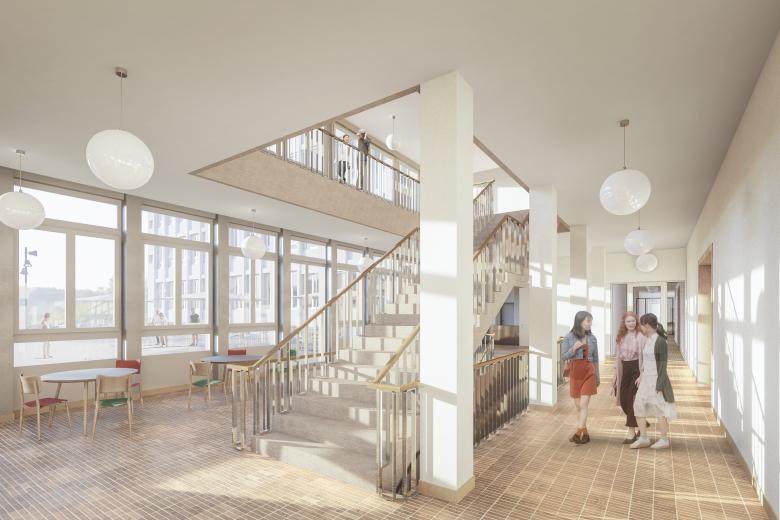 The project aims to integrate the operational requirements of a school into the building fabric as seamlessly as possible while also making the formal disposition of the existing structures more legible. As such, the main entrance will be accentuated by a generous, welcoming canopy that serves to improve orientation for all users and provide external visitors with an entry sequence worthy of a top-tier concert venue. The music school will link a series of contiguous event spaces and music rooms to form a self-contained entity set apart from the secondary school.