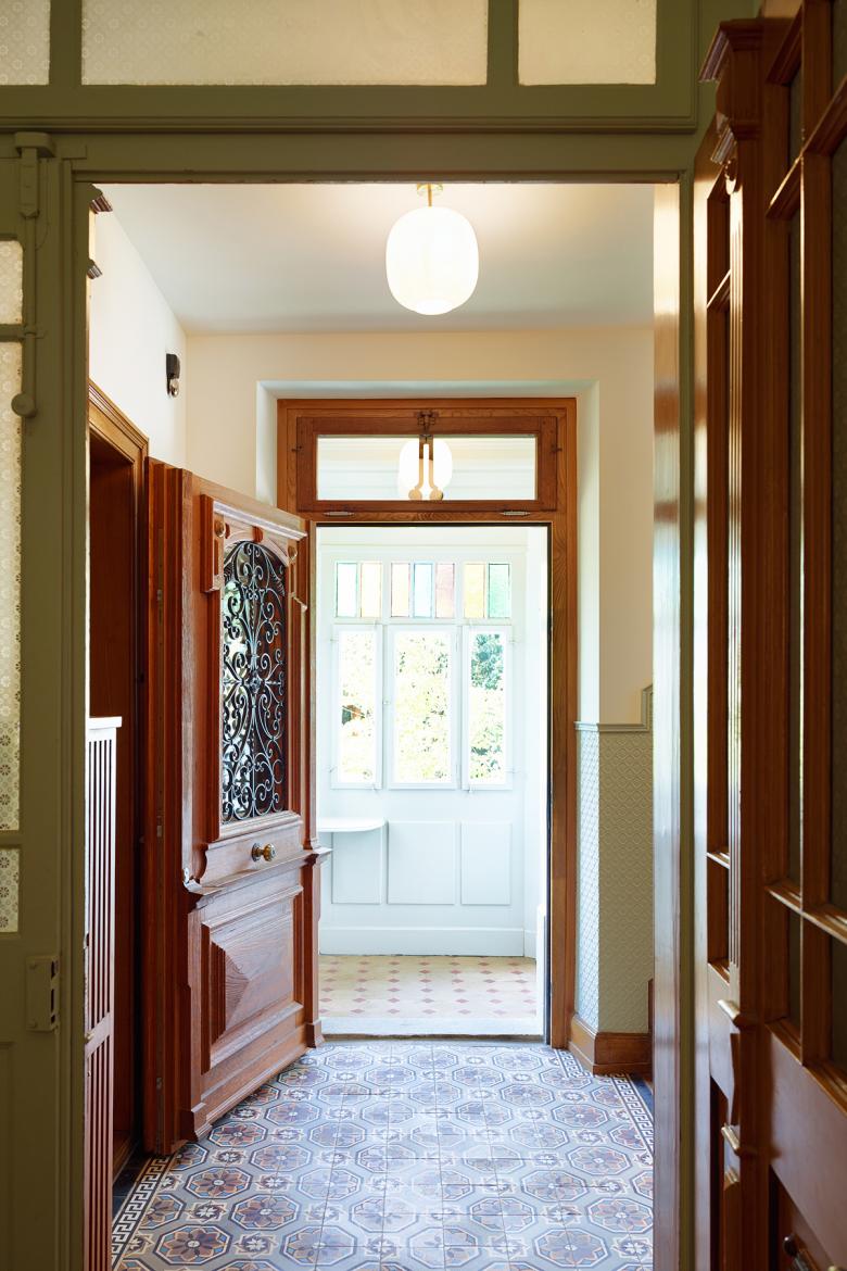 Inside, stucco ceiling mouldings, dadoes, painted imitation wood, some of which is still in its original state, and the careful design of the apartment entrance doors all affirm the historicist approach. All these elements have been carefully restored in accordance with preservation requirements. The roof has been insulated and supplemented with three small windows and most of the original tiles were reinstalled and completed with historical tiles from a conservation warehouse. Spatially, the interventions were limited to the kitchen and bathroom areas on all floors, which have been intentionally designed in keeping with the overall appearance of the historical building. Only the southeast room on the ground floor was modified by partitioning off a narrow space for a cloakroom and a guest toilet.