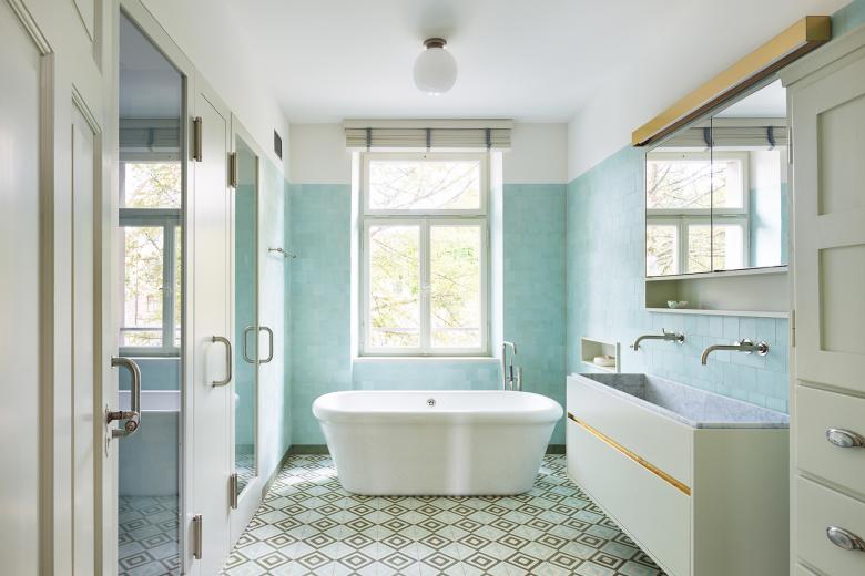 The green which serves as the building’s primary colour and the lincrusta, a deeply embossed wallpaper made of linseed oil and installed in the staircase, resulted from conservation analyses. The historical parquet floors with herringbone and Versailles patterns were sanded and oiled. The dado woodwork was finished in an oil paint brushstroke and the walls with a mineral paint. A seemingly timeless terrazzo and stainless-steel surfaces characterise the design of the kitchen. The bathrooms are lined with Moroccan cement tiles. Graceful green cabinetry, marble-lined washbasins and carefully designed lighting characterise the ethereal bathrooms.