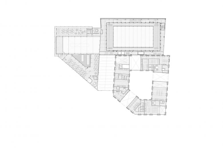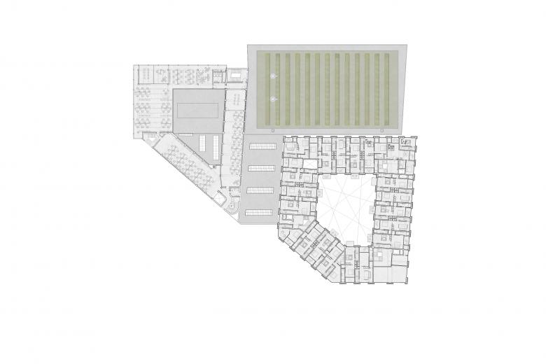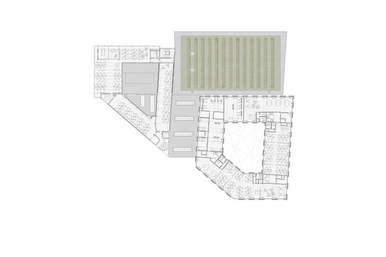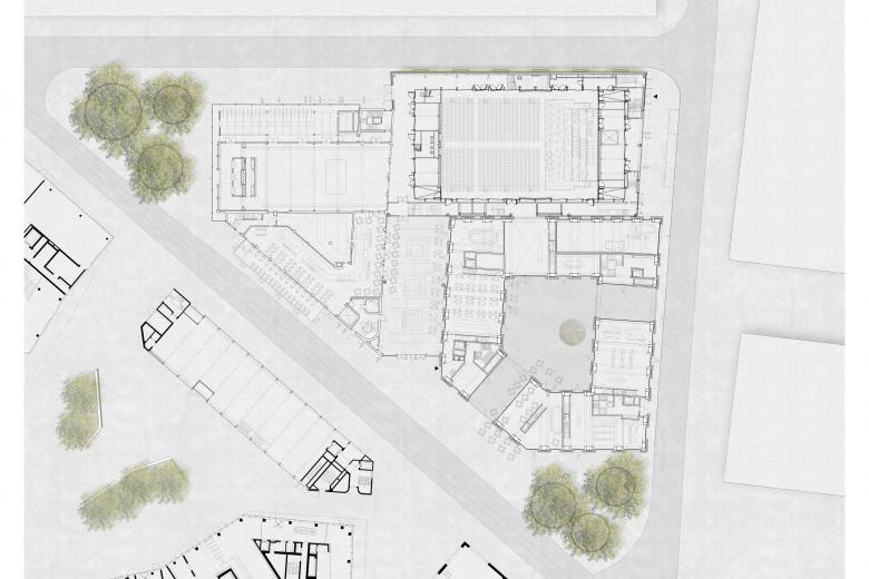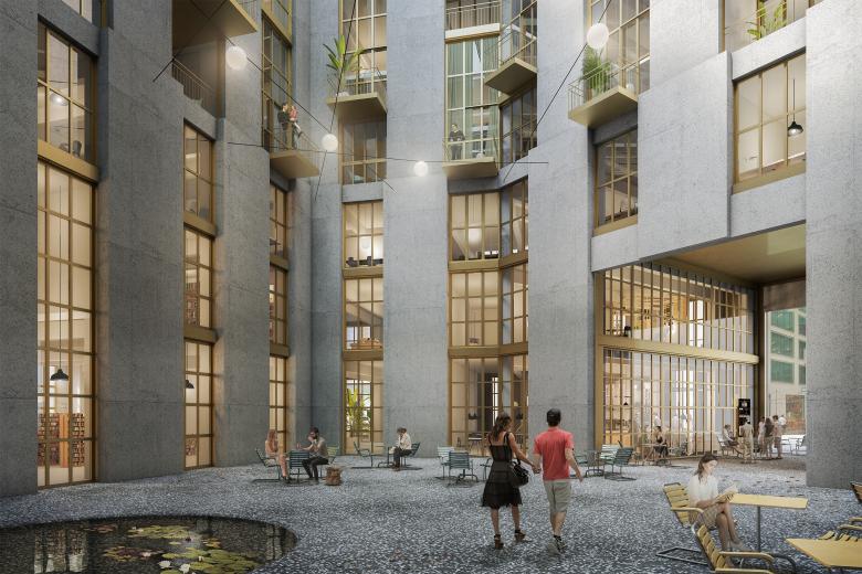 Next to Building K, on the footprint of the former Maag production facility, a new intervention will clearly reference the listed building in both typology and form. The new building will encircle a sheltered courtyard with storey-high entry portals that both connect it to the city outside and allow urban life to penetrate within. Likewise, a wide-ranging programme, including cultural, hospitality, retail, office, studio, and co-working spaces as well as a small indoor market, a fitness centre, and compact maisonette flats, will draw people into the complex.