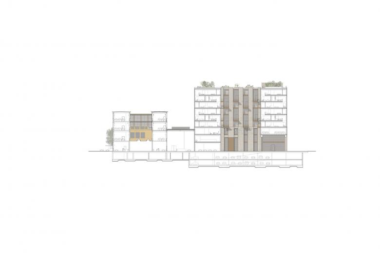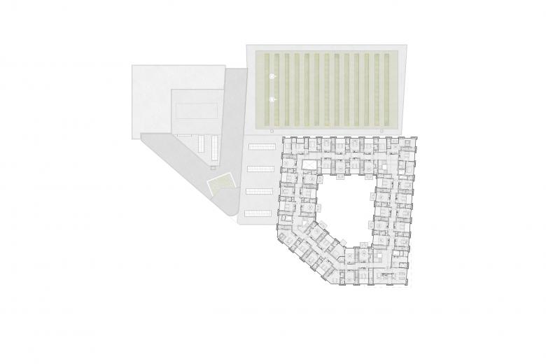 Doubled-up structural ribs lend the proposal an industrial aesthetic and allow flexibility of use. The space between the ribs is alternately occupied by either bathroom or stair cores, an organisational rigour mirrored on the building’s exterior by the vertical banding of precast concrete elements. In between these bands, luminous ribbons of bronze-coloured glazing, interspersed with street-side loggias and courtyard balconies, provide visual contrast. Next to the new intervention, an extension to Building K will also have a distinctly industrial aesthetic, with its ribbed floor slabs visible behind a glazed façade.