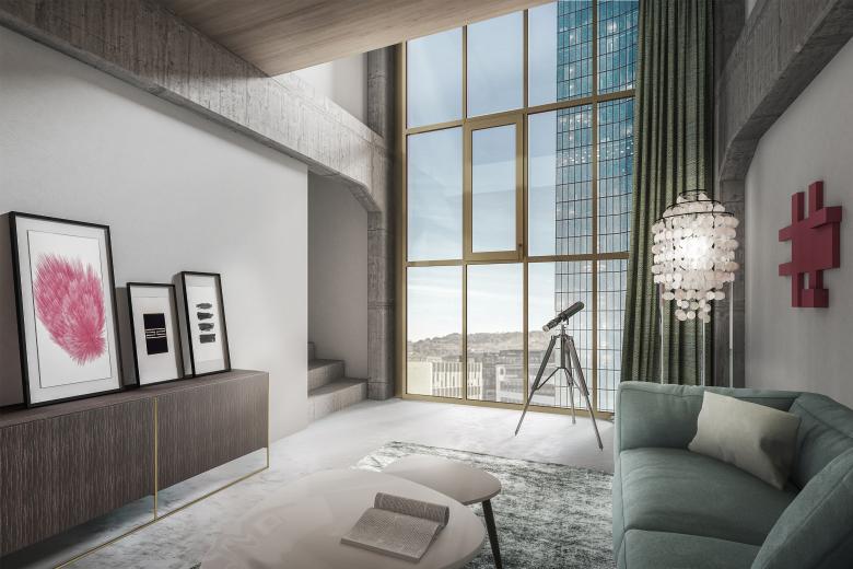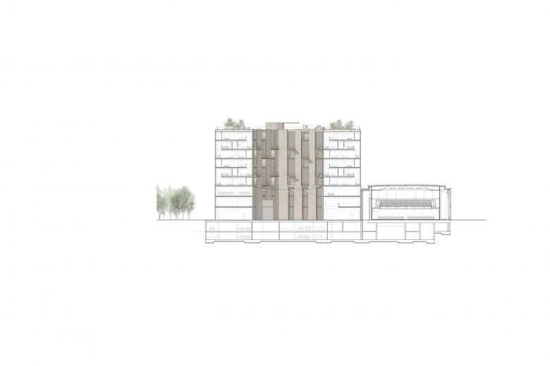 The 82 interlocking maisonettes will occupy the building’s upper six storeys. A central corridor will provide access to the units, which by turn stretch up or down from their entry levels. Despite their relatively small size, double-height living areas will give the impression of space. The maisonette typology will also provide units with a dual orientation to both the block’s bustling, noisy exterior and its tranquil interior courtyard.