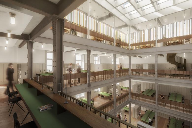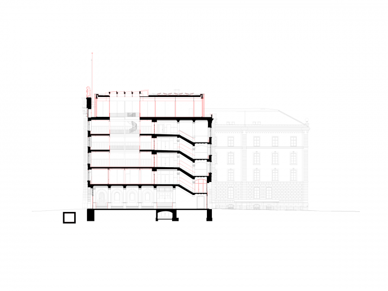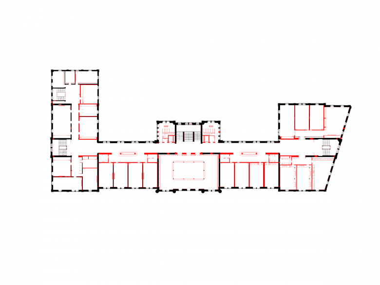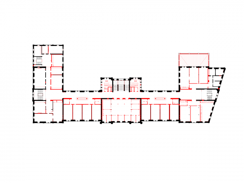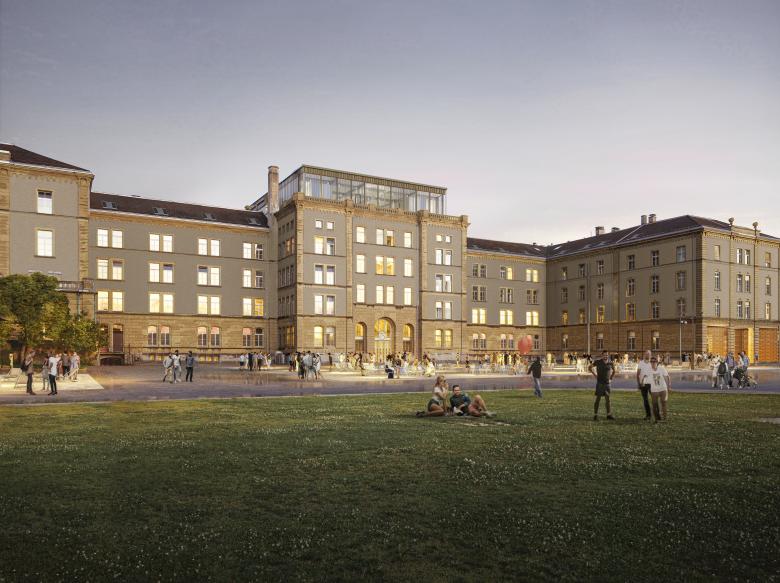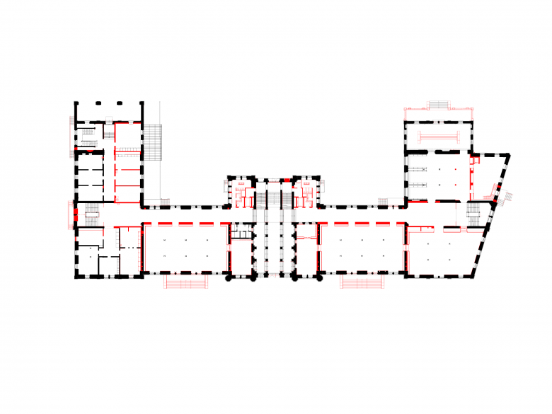 The project proposal consists of converting the old military barracks into an education centre, open to public use on the ground level, and comprised of three measures that would enhance the urban fabric. The plan continues with the spatial logic of the building though its axial arrangement: on the mezzanine level, facing Kasernenstrasse, the currently closed volumes of the 122-metre main façade is opened up with two symmetrically placed terraces flanking the main entrance. They consolidate the landing space, while also extending the large areas of the base level towards the exterior. These outdoor extensions are orientated towards each other and function as interconnected market halls, which also connect directly to the main entrance and the surrounding urban space by means of exterior stairs.