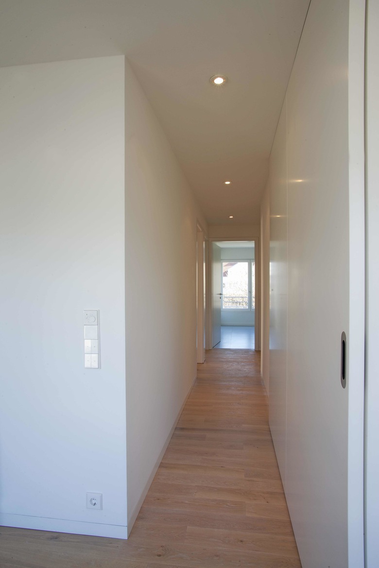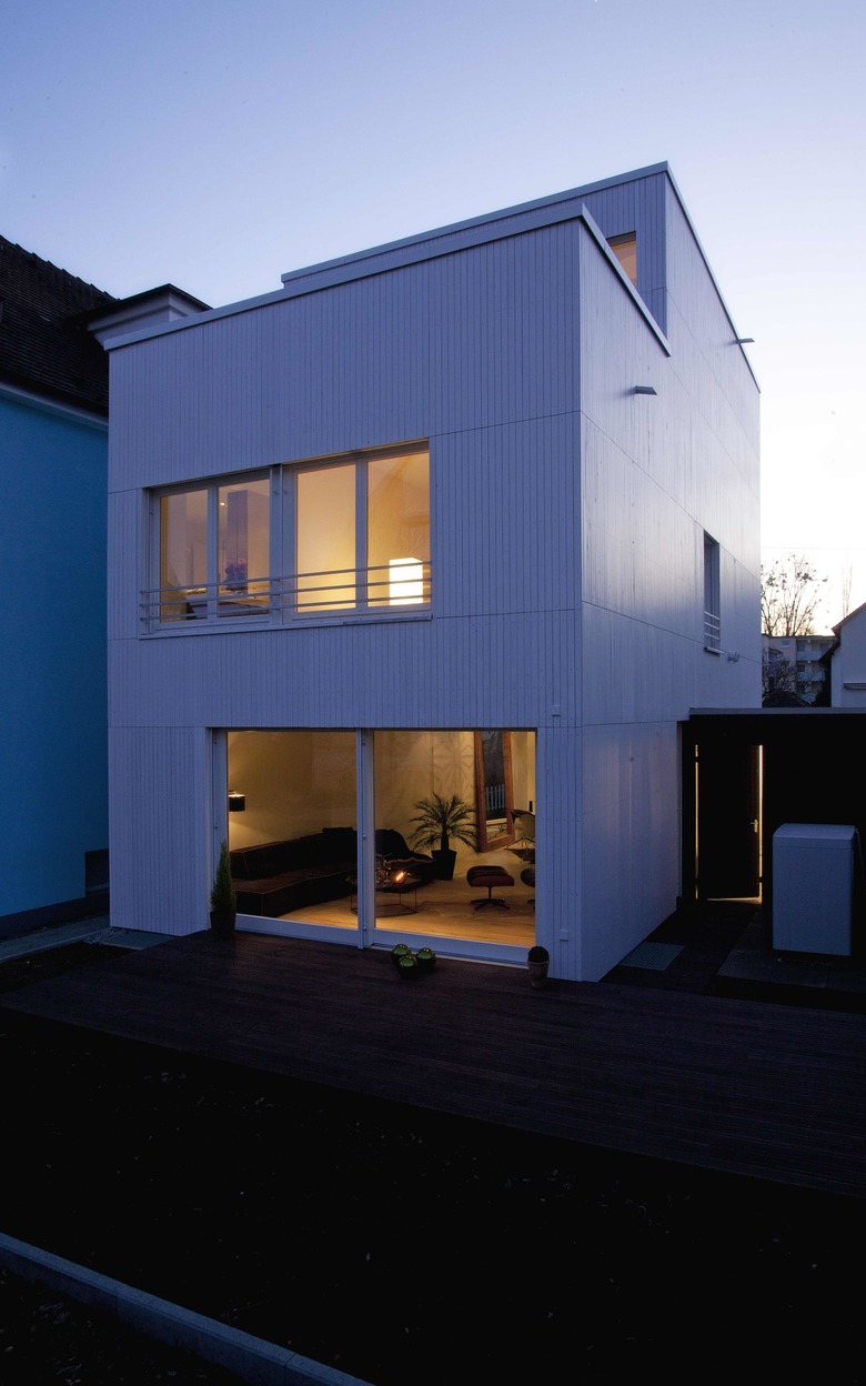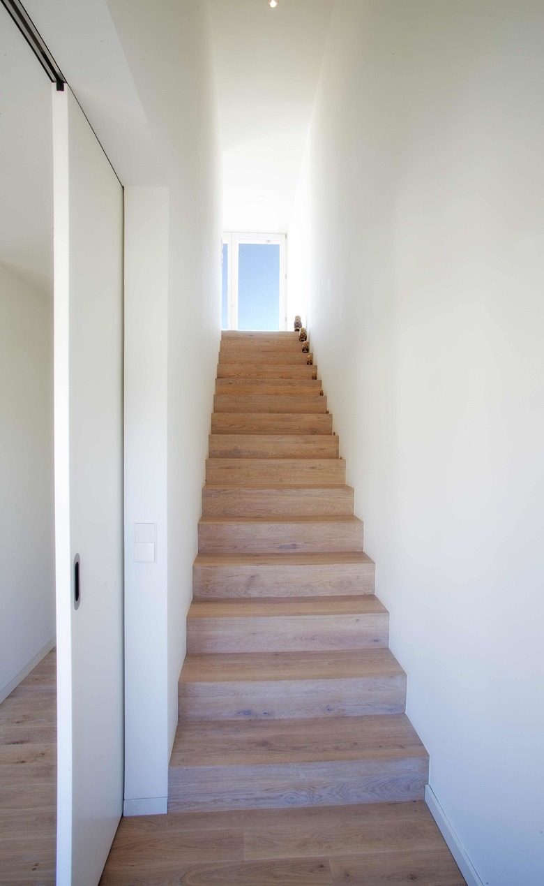 Das auf vier Ebenen gebaute Wohnhaus beinhaltet in der Gartenebene Wohn- und Küchenbereich. In der Zwischenebene sind zwei Individualräume für Kinder/Gäste, ein Bad und ein Büro angeordnet. Eine breite raumhohe Schiebetür trennt die Zwischenebene von der Dachgeschoss-Ebene. Dahinter führt ein zweigeschossiger Treppenraum zum Elternschlafbereich mit Bad und grosszügiger Dachterrasse.