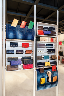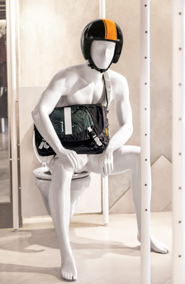 Each category was designed as an installation, with a clearly recognizable character of its own. The watches are displayed inside bird cages, the belts are casually worn around a mannequin (our Iron Lady) with surrounding poles covered in leathers and studs. The bags are suspended in rope using carabineers and wallets hang out from back pockets of denim wear from where they are meant to be pick-pocketed. Eye wear is displayed on bright yellow bananas, helmets are mounted on expressive trophy heads, and old beaten up trunks, floating tables, mirrors, reconditioned refrigerators, urinals and WCs are used as display devices.