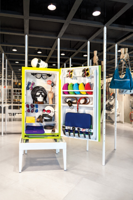 The space unfolds through a series of installations and events. A physical grid of white pipes forms the basis for a grid, from which various display systems are suspended. This meshwork of grids hides away services and lighting, and supports various display systems. The merchandize is a complex mix of watches, wallets, bags, belts, helmets, eye wear, etc. objects of various scales that needed equal presence in the store.