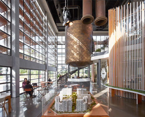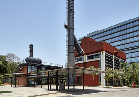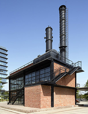 Two former power co-generation plants and a boiler were repurposed to accommodate new functions as a Studio, Workshop and Cafe respectively. A tall chimney redolent of bygone industrial aesthetic has been treated as a graphic memorial.
