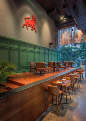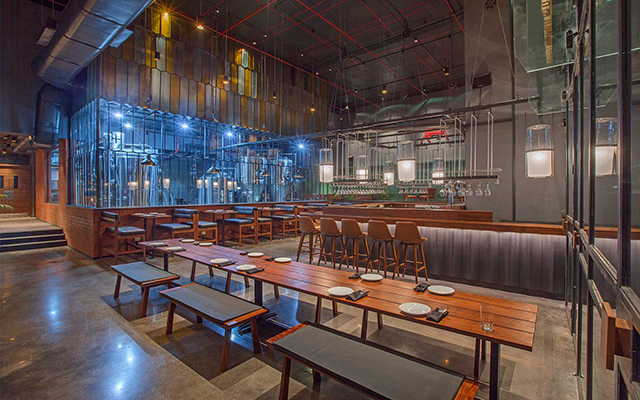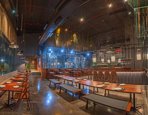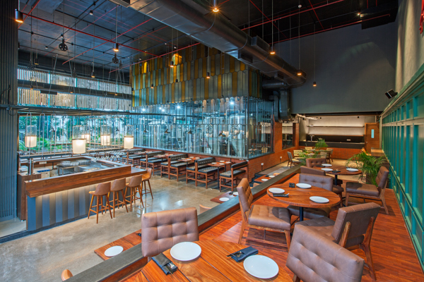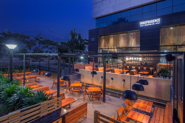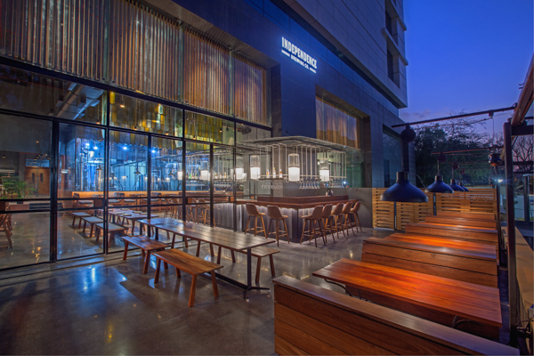 The project is sited in an independent space in a commercial office complex in Pune. It comprises a large floor plate - a 600 sqft microbrewery on showcasing the brewing process, 3800 sqft of indoor space, besides two split level outdoor areas of 1500 sqft and 600 sqft of services.
