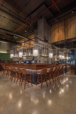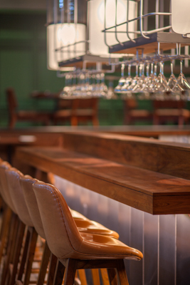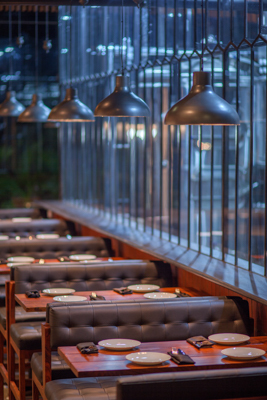 The primary challenge was to make the space multi-functional, allowing for casual business lunches, early evening drinking, to dinner for groups and even arrangements for live music events. The micro-brewery and a large island bar anchor the experience, naturally dividing the space into multiple zones. The bar extends into the outdoor space and allows for a seamless flow of the inside with the outdoors. The brewery is pulled into a double height volume to create a theatrical setting for the equipment. The glass partition encasing it is fabricated as a hand-milled mild steel framework with textured and clear glass to form an articulated frame that contrasts with the polished stainless steel tanks.