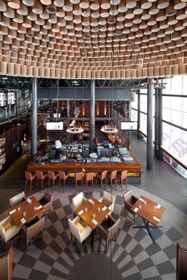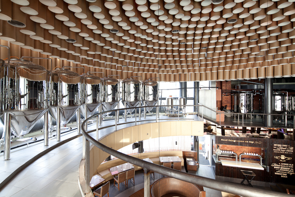 The large cylindrical volume comprises the restaurant that gets light from the North sun while the bar/ lounge has been tucked into the darker factions of the space. Placed at the mezzanine level, the brewery not only utilizes the height and volume of the site but also becomes the backdrop to the entire experience. Wherever you are in the restaurant, you get a glimpse of the brewery so that it becomes a constant reminder of the fresh beer being served.