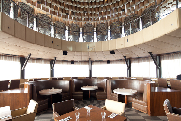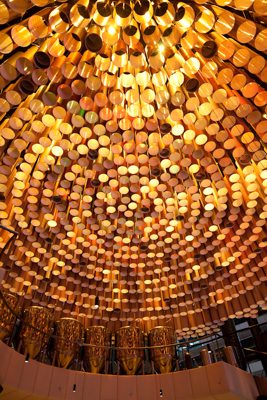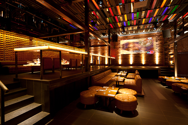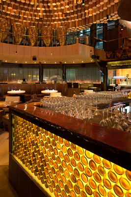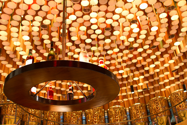The use of low cost recycled/recyclable materials such as paper tubes, old bottles, stained glass and chain mail, contrasted against the luxurious materials of leather and fabric. Various seating arrangements in diverse configurations cater to customers coming in both small and large groups and provide varied experiences of the space.