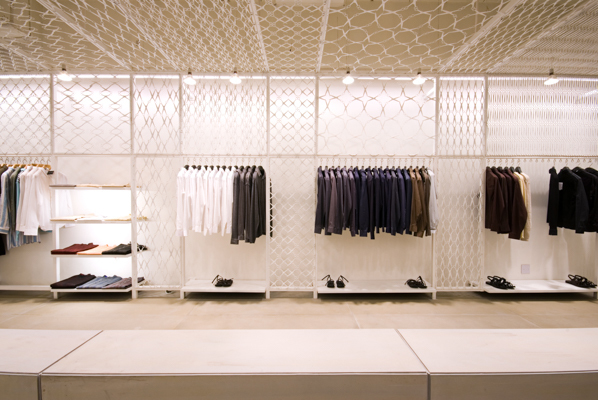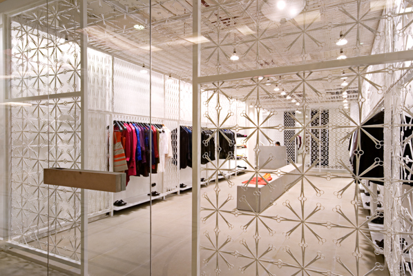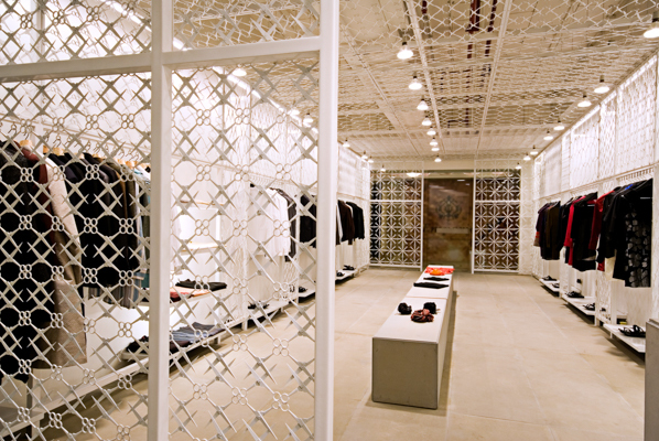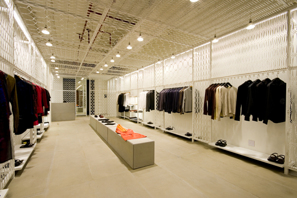 Scissors were laid into motifs and patterns to create a lace like surface which was then wrapped on the walls and ceiling to form an enclosure. Thousands of scissors of different kinds made from iron to various alloys were sourced, for this metal lacework and in the process a large number of them were rejected too, as they did not have the structural strength required for the welded panels. The entire metal mesh and the building shell were then painted in an identical white and the grey sandstone floor was given a texture using shot blasting and brushing techniques. The stone also wraps around the cash desk and rises upwards in the center of the store to form a display block. Reinforcing the simplicity and rawness of the thought the lighting was done using basic lamps suspended through the mesh, neatly aligned along the metal framework giving the store the required ambient light level. The signage for the stone was cut metal letters mounted on the store floor.
