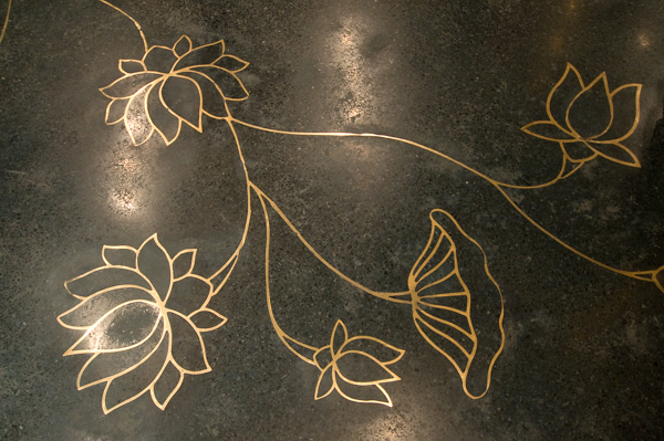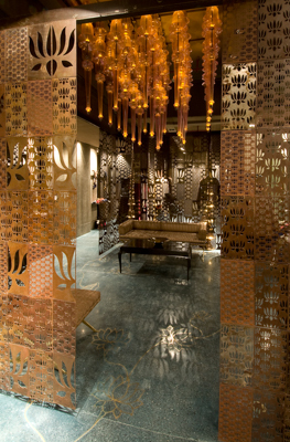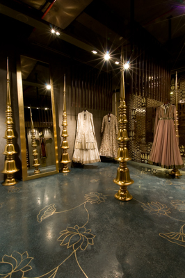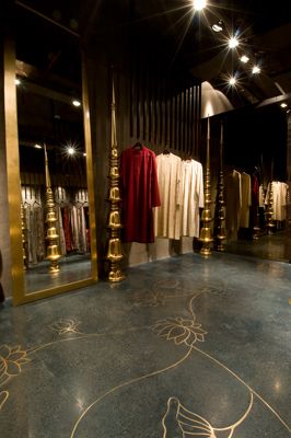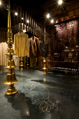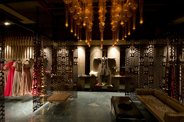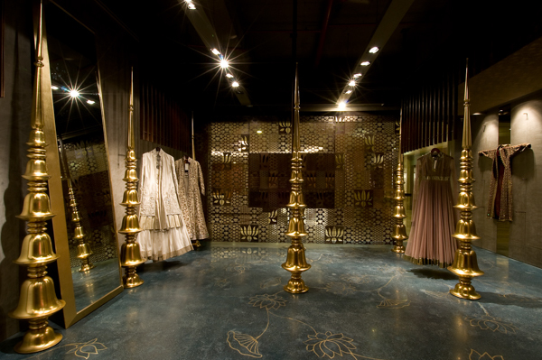 The "lotus" motif developed and used extensively in their garments by Rohit Bal's studio have been interpreted in various forms in the store. The flooring is rendered in blue pigmented cement with the lotus inserted as a brass inlay. Display podiums and furniture in the store is detailed with lapis lazuli stone inlay in dark wood. The central structure and the facade have been detailed with suspended CNC-cut lotus motif jaalis in rusted metal. The jaali provides an enclosure for the Salon. The Salon space is lit with is a blown glass chandelier designed and executed with inputs from Rohit Bal. The chandelier forms are an extension of the cast brass sculptures laid out in the main browsing space grounding the multiple elements in the store.