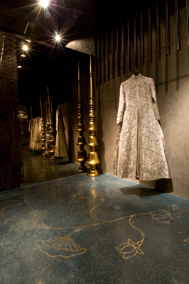 This low-height space embellished in woven fabric with a lotus motif from Rohit Bal's studio provides for the main circulation passage in the store. Tall leaning mirrors and vertical wall cladding with mirrors in the circulation space break up the structure and provide glimpses of the store from varied viewpoints. The garments have been hung from the ceiling with a mild steel sculptural detail which allows the garment to be spaced out uniformly.