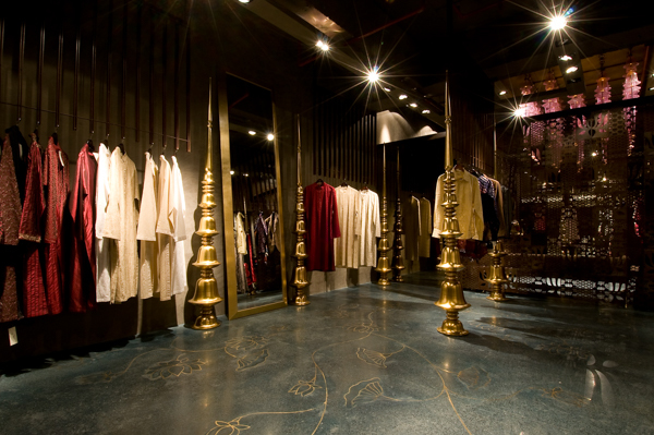 The brand Rohit Bal signifies luxury and opulence. His merchandise consists of a variety of exquisite intricately crafted garments, which are visually as well as physically fairly heavy in nature. The retail space for Rohit Bal is structured around two segregated sections for the women's wear and men's wear in the store. The brief for the store required for the men's section to be secluded, this was achieved by placing the salon in the centre of the rectangular space. Brass pillar structures from the ceiling gives a rich traditional Indian touch to the space. To take an advantage of the height ceiling already available the services were moved along left length of the store.