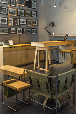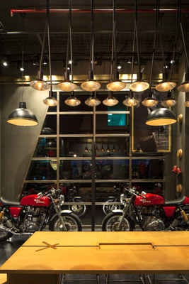 Located in the vicinity of one of the busiest malls in the city, the 1200 sqft store gets a lot of visitor footfall. Since the concept is ‘living in the garage’ the shell has been kept grey and textured. The idea was to create different living pockets in the space- a dining space with a community table, a comfortable living room and other seating pockets to encourage customer interaction. The wood, metal and canvas furniture brings in warmth and comfort in the space. Tall display ladders are used in the store as partitions dividing the store into four zones for the four categories of motorcycles in the store. The café racer zone talks about the sense of community, the thunderbird zone tells the story of the traveller, the classic zones depicts the vintage legacy and the bullet zone celebrates the brand’s most loved bike.