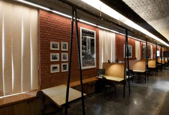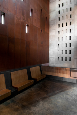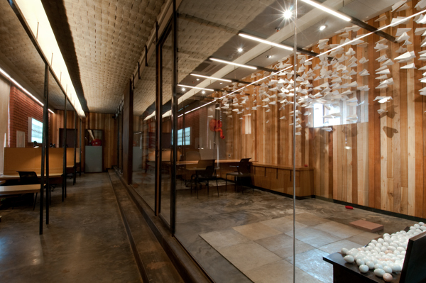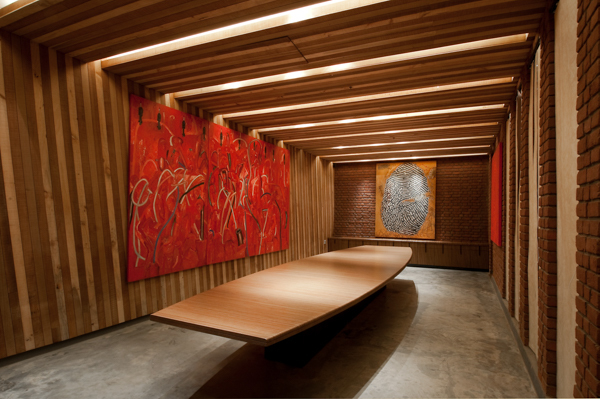 The interiors of this space drew direct inspiration from the exterior facade of Corten steel, brick and concrete that enveloped the building of the corporate headquarters of the paper mill, the Sirpur House. The previously constructed two separate wings of the building were now linked together with metal bridges.