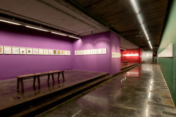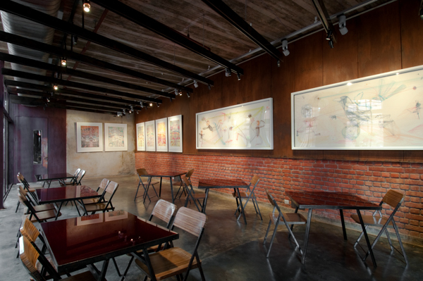 The cafe, which opens out from the reception and into the court, houses a trellis that is replicated on the diagonal skeleton of the building. Mirror and clear glass sandwiched with film have been used for the table tops. The Galleries have been configured in such a way so as to allow flexibility and adaptability in accordance with the changing shows. The emerging result highlights the effortless intermingling between the external and internal spaces of a structural system.