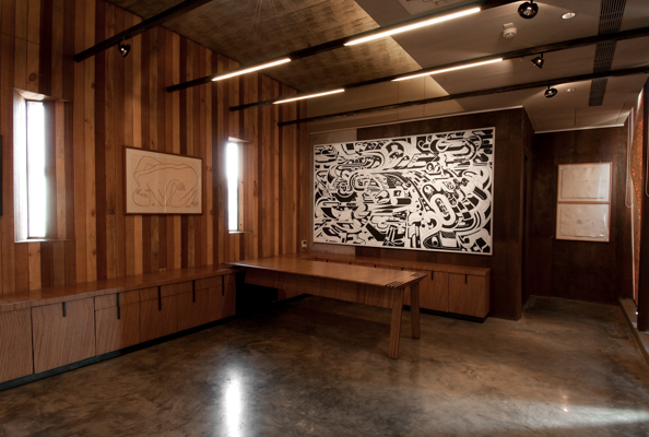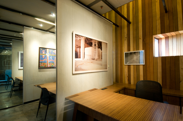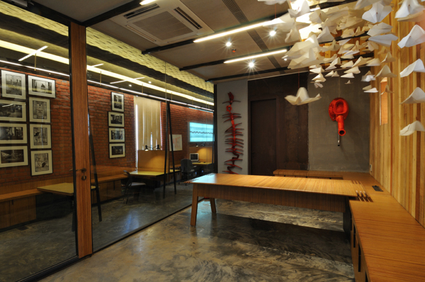 The internal construct was shaped as a neutral yet malleable canvas to the many functions and stunning art works it houses. The atrium that spills through the entire side of a wing implies the influence of the “paper story” in its concept with paper rolls acting as the inspiration for the furniture that were crafted out of sandwiched plywood sheets to unfold as origami-like sculpted forms of sweeping planes of paper. The flooring of all the areas have been treated as vacuum dewatered floors to enhance their natural finish. A screen cascades down from the ceiling to the floor and cordons off the service block while aligning itself to the AC louvers.