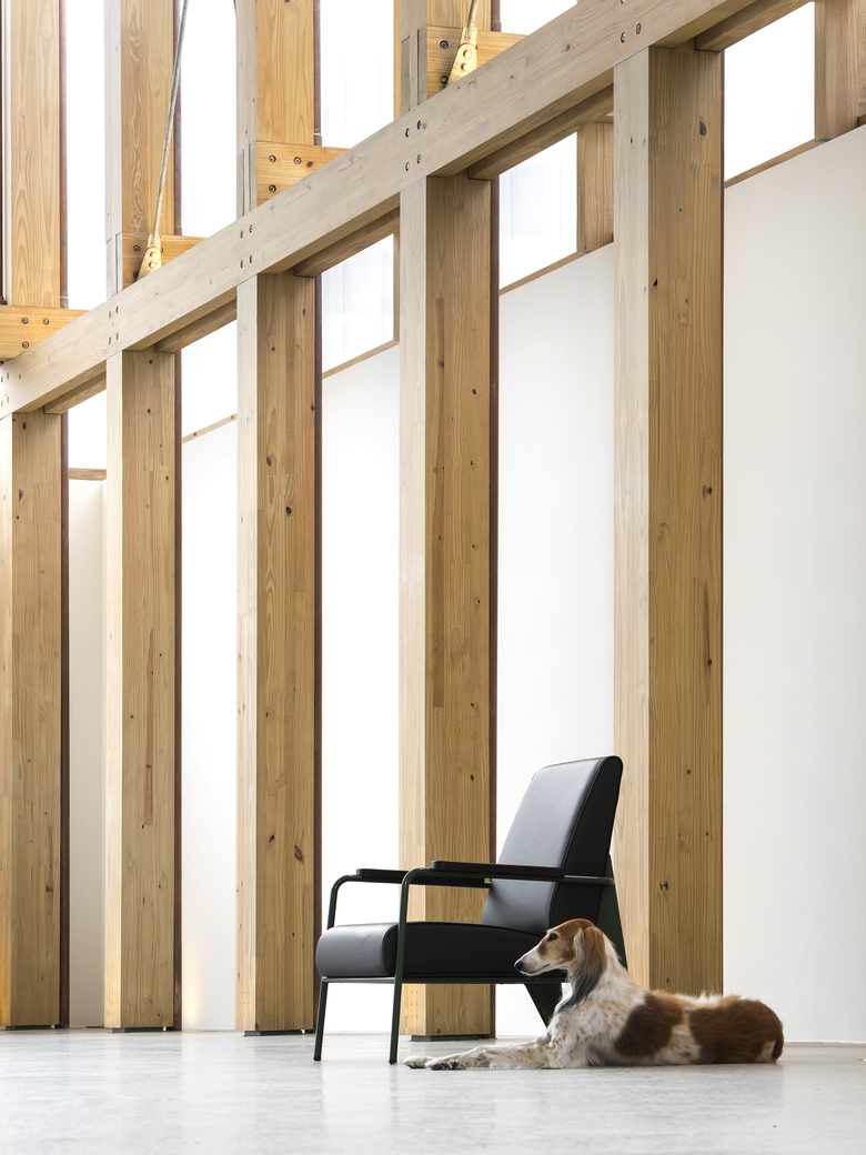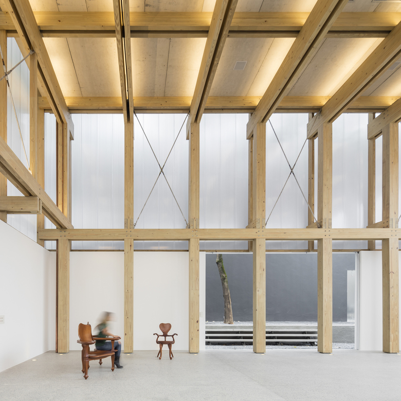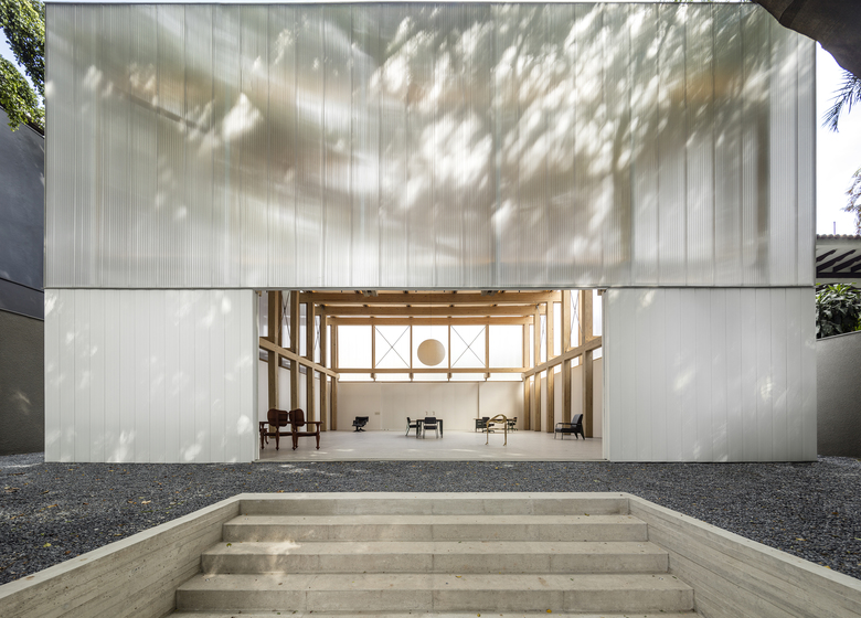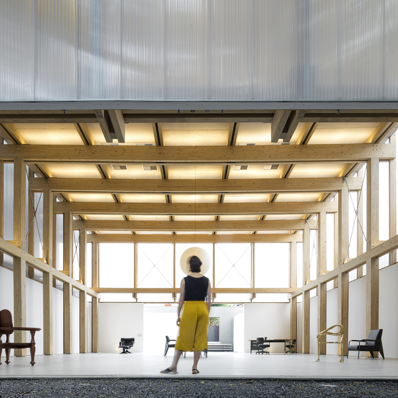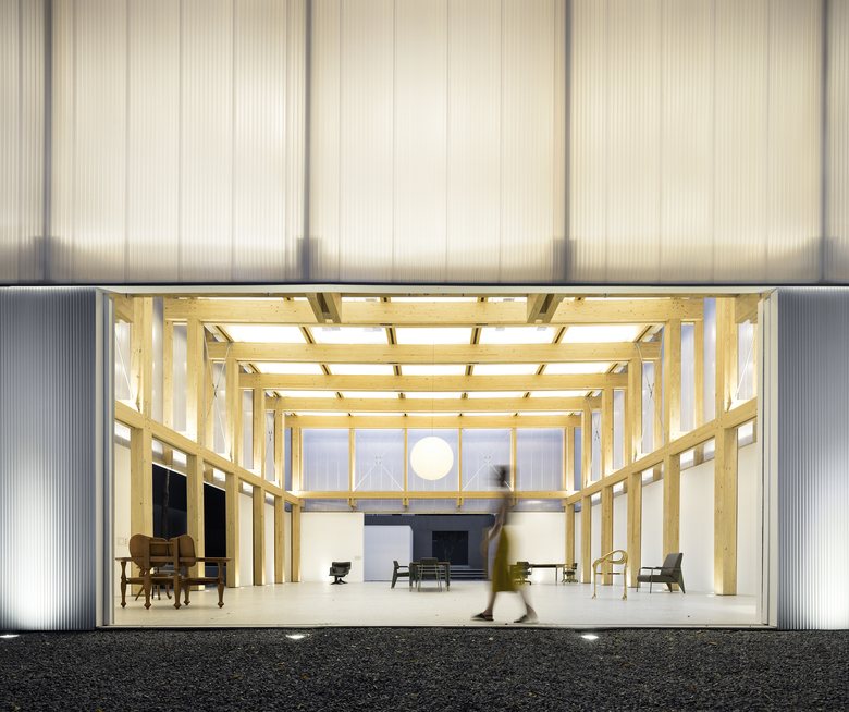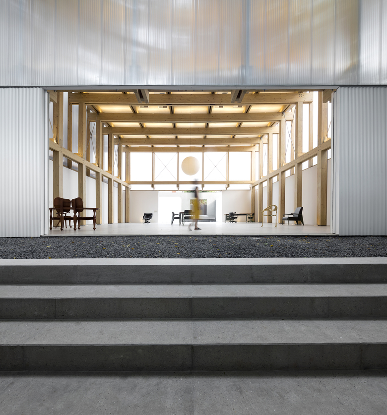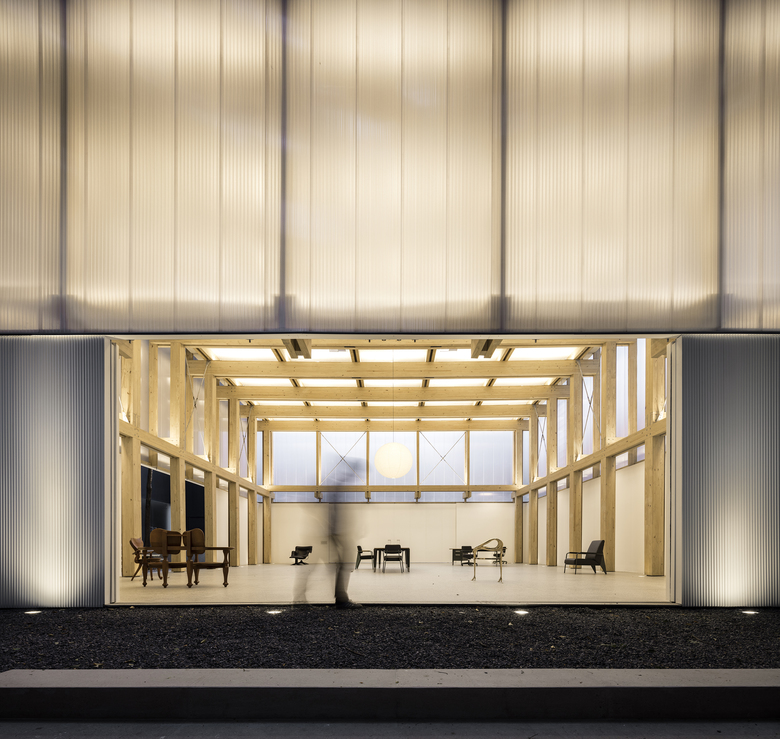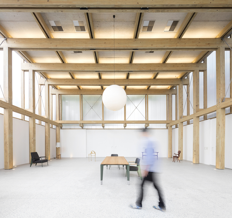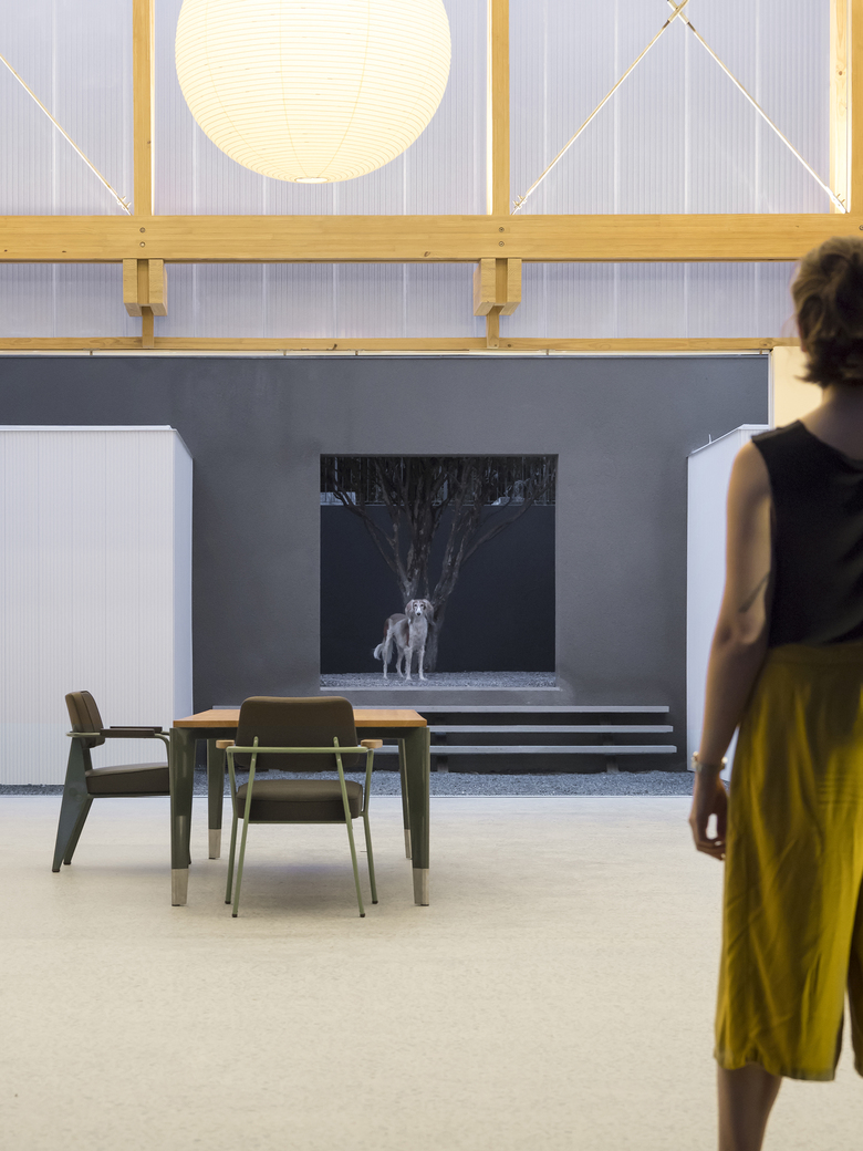 The demand for a flexible program led to the creation of an internal space that allowed for several possible uses: shop, exhibition space or temporary residence for invited artists, on a caravan that fits inside the space. The resulting space is a 15x15m floor plan with a 7,5m ceiling height. An Isamu Noguchi's pendant lamp punctuates the double symmetry of the space and explores its vertical dimension.