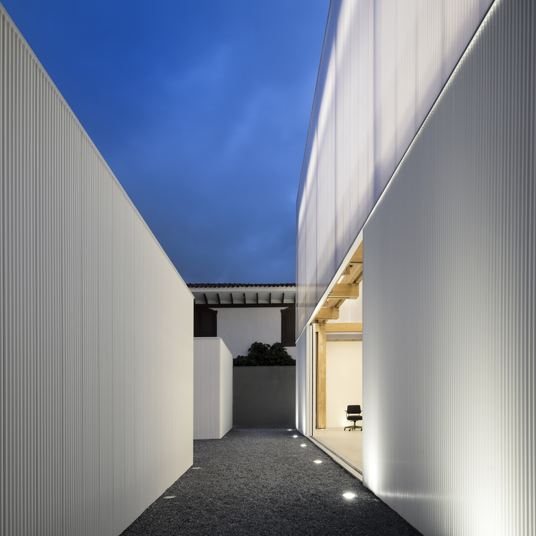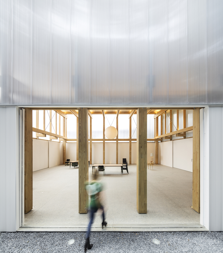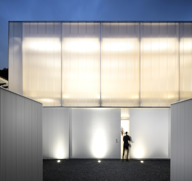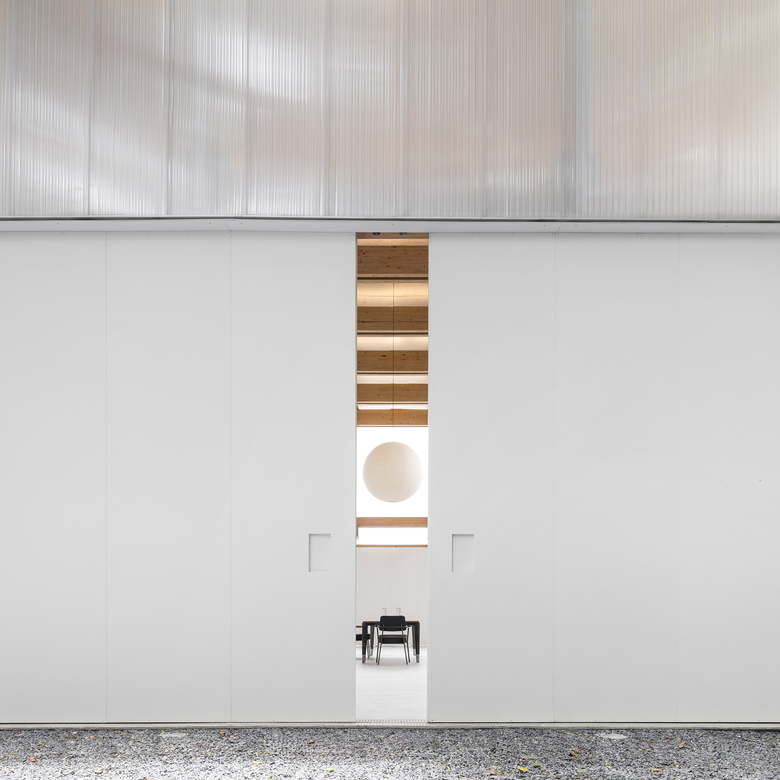 The building’s envelope is made of folded sheets of two different materials: translucent polycarbonate in the upper half and a white metal plate in the lower one. During the day, the shadows of surrounding trees are projected onto the façade, bringing the poetic movement of light and nature into the inner space.
