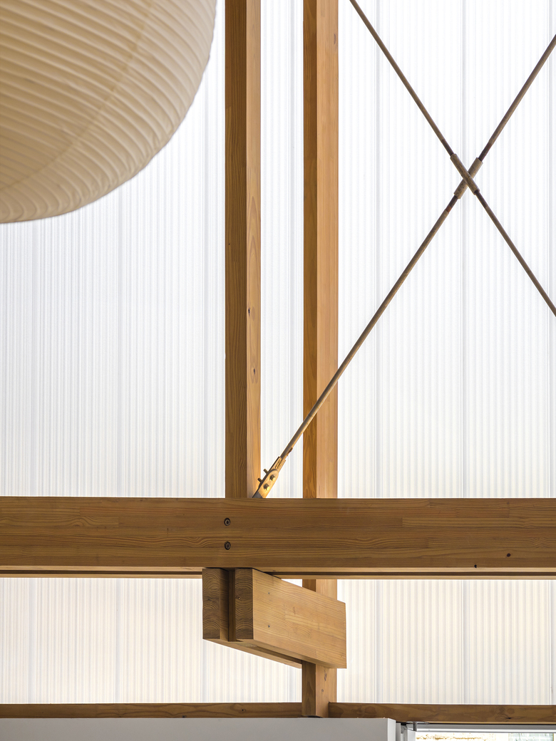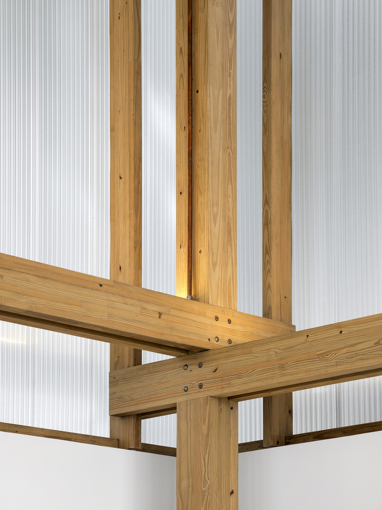 A substructure supports the skin of the building and creates a gap between the plane of the façade and the pillars. This distance reinforces the reading of the rhythm and of the simple fittings of the wooden elements.